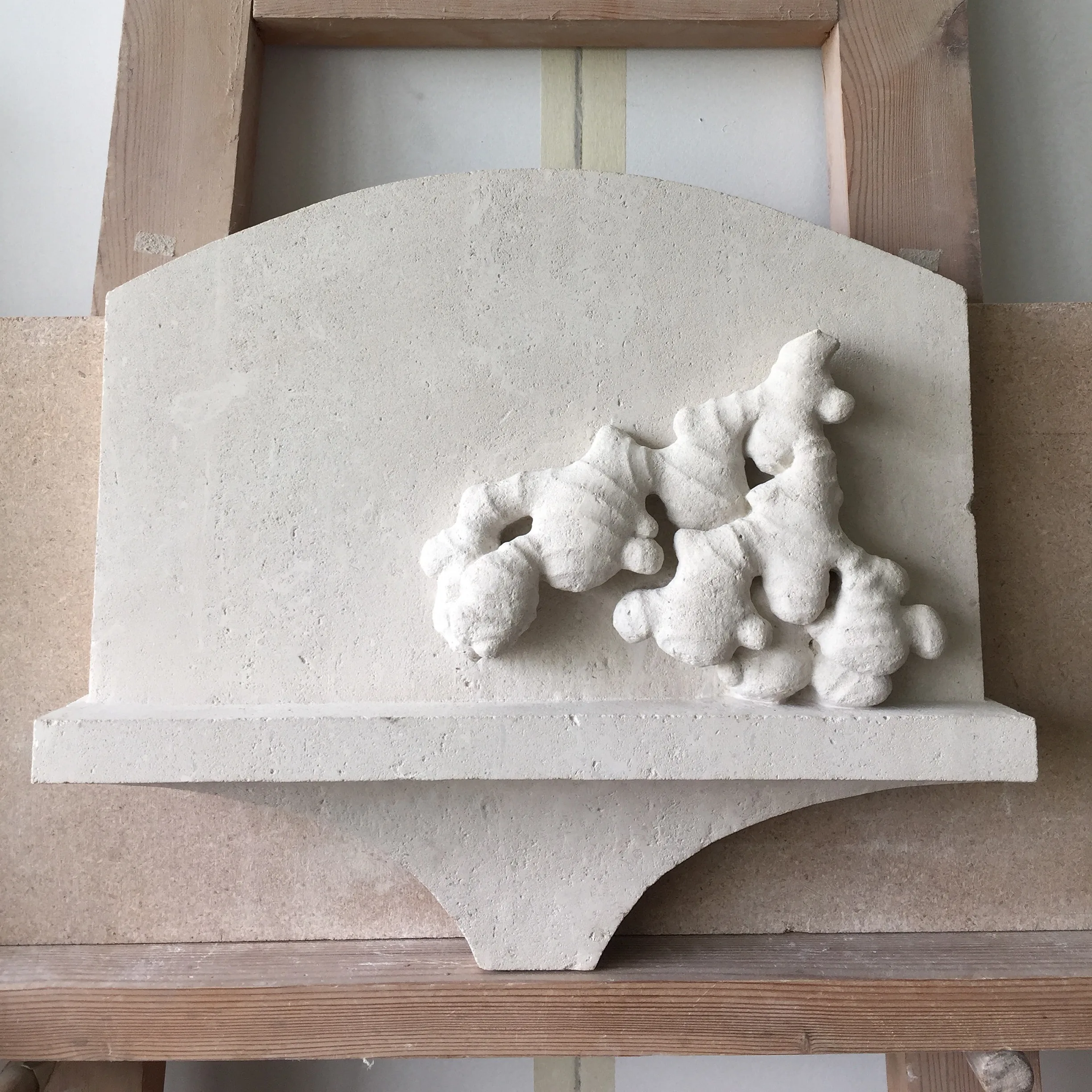 翌年にはバーミンガム市立大学の研究者カレン・パテルと共同で英国のクラフツ・カウンシルが行った「結集」展(We Gather、2022)(*17)がある。白人中心の工芸界を修正しようというイニシアティブの一環として行われ、女性ブラックアーティスト5人と「ブラック職人」展で選ばれた4人の作品を紹介するものだ。ベネット=メイルの生姜のレリーフも展示された(挿図5)。彼女は野菜や果物などを彫刻にするが、なかでもこの初期の作品には英国国教会のセント・ポール大聖堂の建材である石灰岩の一部を再利用して作った墓石と生姜という以外なものが組み合わされている。英国人の日常であり伝統的食卓にかかせない生姜が精緻に彫られ、まるで名も無い人の墓碑のようなユニークな作品になっている。
