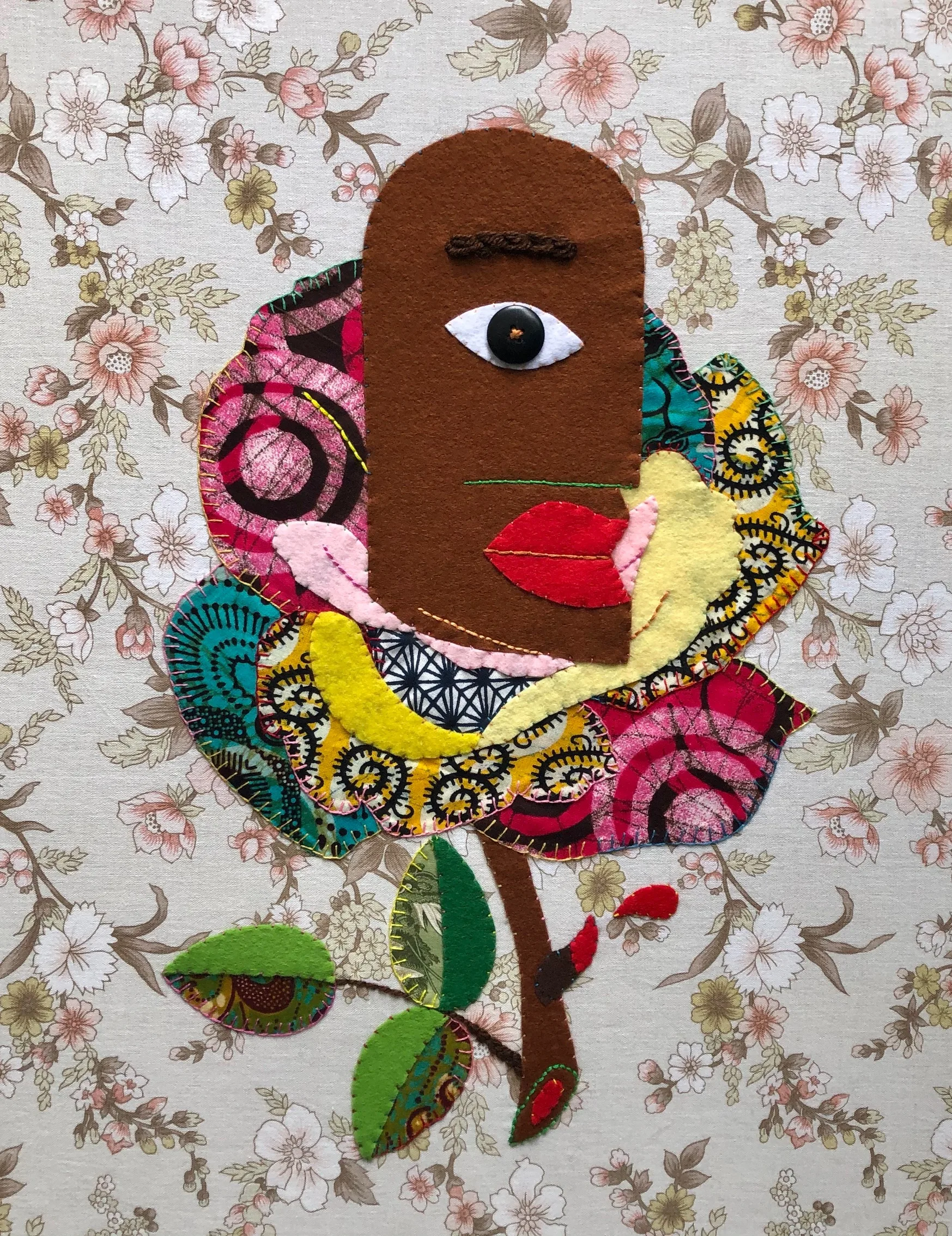 別の作品《パスポート》(Passport、2020)などにも同様に現れるように赤い唇の色は英国の国旗と呼応しており、タイトルからもわかるように差別と自身のイギリス人としてのアイデンティティへの問いがある。真理の審判を迫るような大きな片目が中心にありこちらを挑戦的に直視している。その背景には自分が育ったイギリス的な花柄のレトロのチンツと、アフリカを表象するろうけつ染の布などが重ねられた可憐なアップリケが配され、ソフトな手芸的なメディアによるアッセンブラージュを楽しみながら意図的に使っている。イギリス的なものはノスタルジアを共有し、アフリカ的なものは「他者」への「エスニック」なものへのまなざしが感じられる、そんな英国における自分をとりまく環境との交渉も見られる。