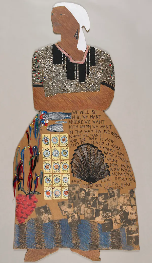 ヒミッドが「ブラック女性のとき、いま」展で展示した作品《いつかきっとなる》(We Will Be、1983、挿図1)はその苦境と強い意志が表されている。舞台装置のようにベニア板を荒く切り取られたアフリカ奴隷、または庶民労働者の女性が固く腕を組み地に足をしっかりつけ立っている。無名の彼女の着るスカートには奴隷反対や人種差別反対運動で有名なネルソン・マンデラやボブ・マーリーの写真と無名の女性解放運動家の写真がコラージュされ、そこに書かれたテキストは「いつか自分が成りたいと思う人になってやる/行きたいと思うところで/一緒にいたいと思う人と/やりたい方法で/やりたいときに/そのときはいま/そしてその場所はここ/あそこ/ここもあそこも/ここで/今/今/今」という彼女たちの決意である(*4)。