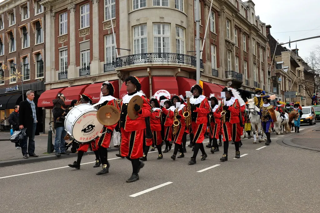黒いピーターは聖ニコラウス(サンタクロース)の従僕として現れる黒人で、顔を黒く塗り、唇を真っ赤にし、アフロヘアのかつらをかぶり、金環のイアリングをつけてルネッサンス風のコスチュームを着て街を行進し子供にお菓子を配る12月の祝祭慣習である。スコット自身がその慣習に遭遇し深い怒りをもった経験がこの作品制作の発端である。欧州各地にあった民話から19世紀以降のオランダで奴隷や人種差別的な要素が加えられ現在に続いている。その問題は表面化してホットな議論が行われつつある(*20)。
