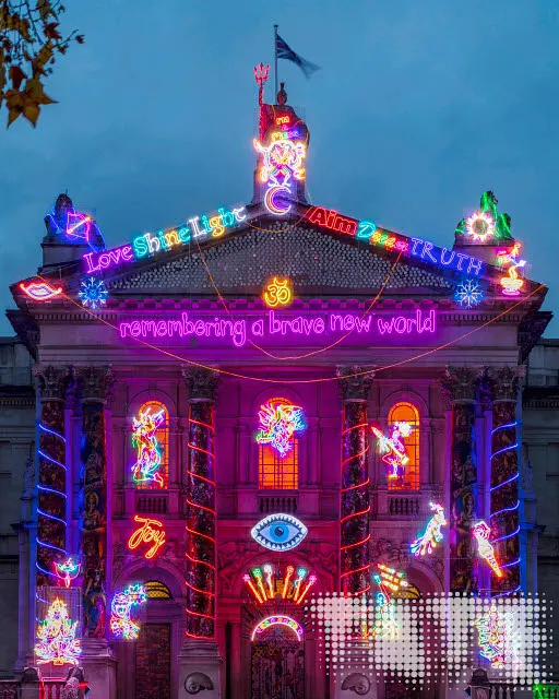 キリスト教のクリスマスとヒンドゥーのクリスマスのようなお祭りディワリ(光の祭り)が重ねられた祝祭である。長く暗いトンネルの先に見える光、知の光明などを象徴するディワリの光である。ガネーシャ神、ラクシュミ女神、植民者による虎狩によりほぼ壊滅したベンガルの虎、そしてラクシュミーバーイー(Lakshmibai、1835頃〜1858)のような植民地支配に抵抗した実存の女性の戦士などもその一見カラフルで陽気なネオンの飾りを構成している。テート・ブリテンの脱帝国主義的な表現として、屋根の突先に鎮座する大英帝国の守護神ブリタニアの彫刻の上に、破壊と殺戮の象徴であるヒンドゥーの女神カーリーを象ったネオンが被さり、「私はメチャクチャ状態」(I’M A MESS)のサインがコロナ禍による混乱、そして植民地支配により引き起こされた混乱状態を指す。