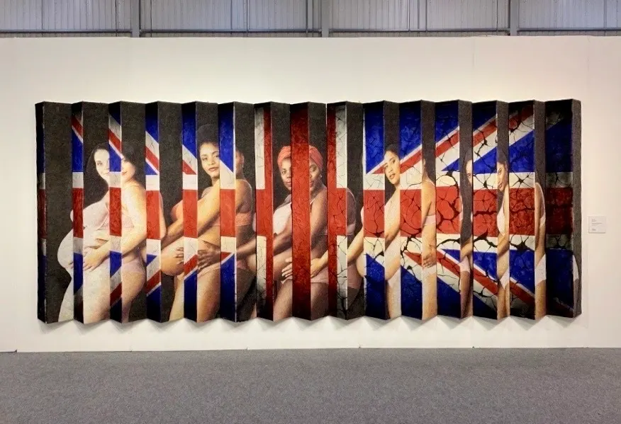 《国民保険?》(National Health?、挿図8)という作品は蛇腹状の立体的な壁面作品で5人の健康そうなブラックの妊婦が並んで横目にこちらを直視している。突起した部分と膨らんだお腹が呼応して身体性が強烈に感じられる。その背景のデザインは国旗のユニオンジャックだ。角度を違えてみるとある女性たちはその国旗に隠れて部分的に見えたり見えなくなったりする。「国民保険」と名がついているにもかかわらず、その制度下ではお産のときのブラックの妊婦の死亡率が白人の妊婦と比較して5倍、死産率は白人の女性に比較してその121%であるということにショックを受けて作られた。