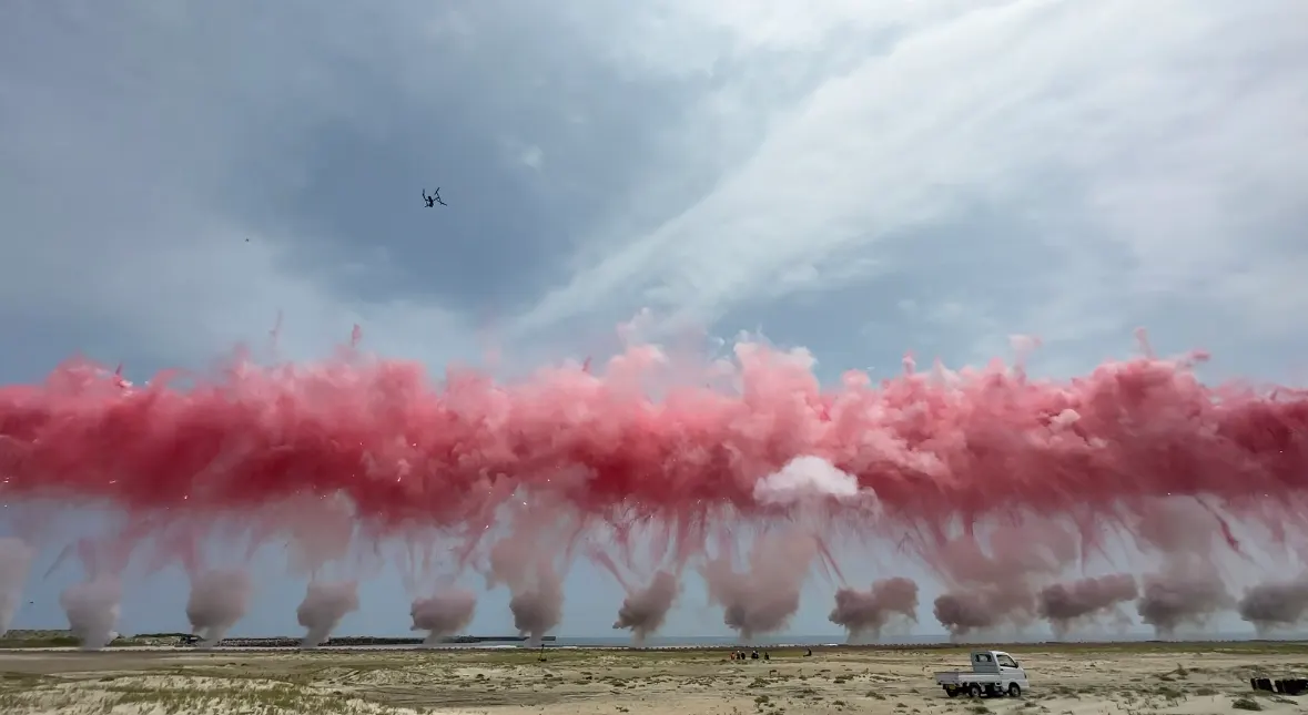 国立新美術館で6月29日に始まる大規模な個展「蔡國強 宇宙遊 ―<原初火球>から始まる」に先駆けた関連イベントとして、サンローランのコミッションとして開催されたこのイベント。花火と鮮やかな煙はこれまで見たことのない風景を作り出し、人々を驚きと感動に巻き込んだ。