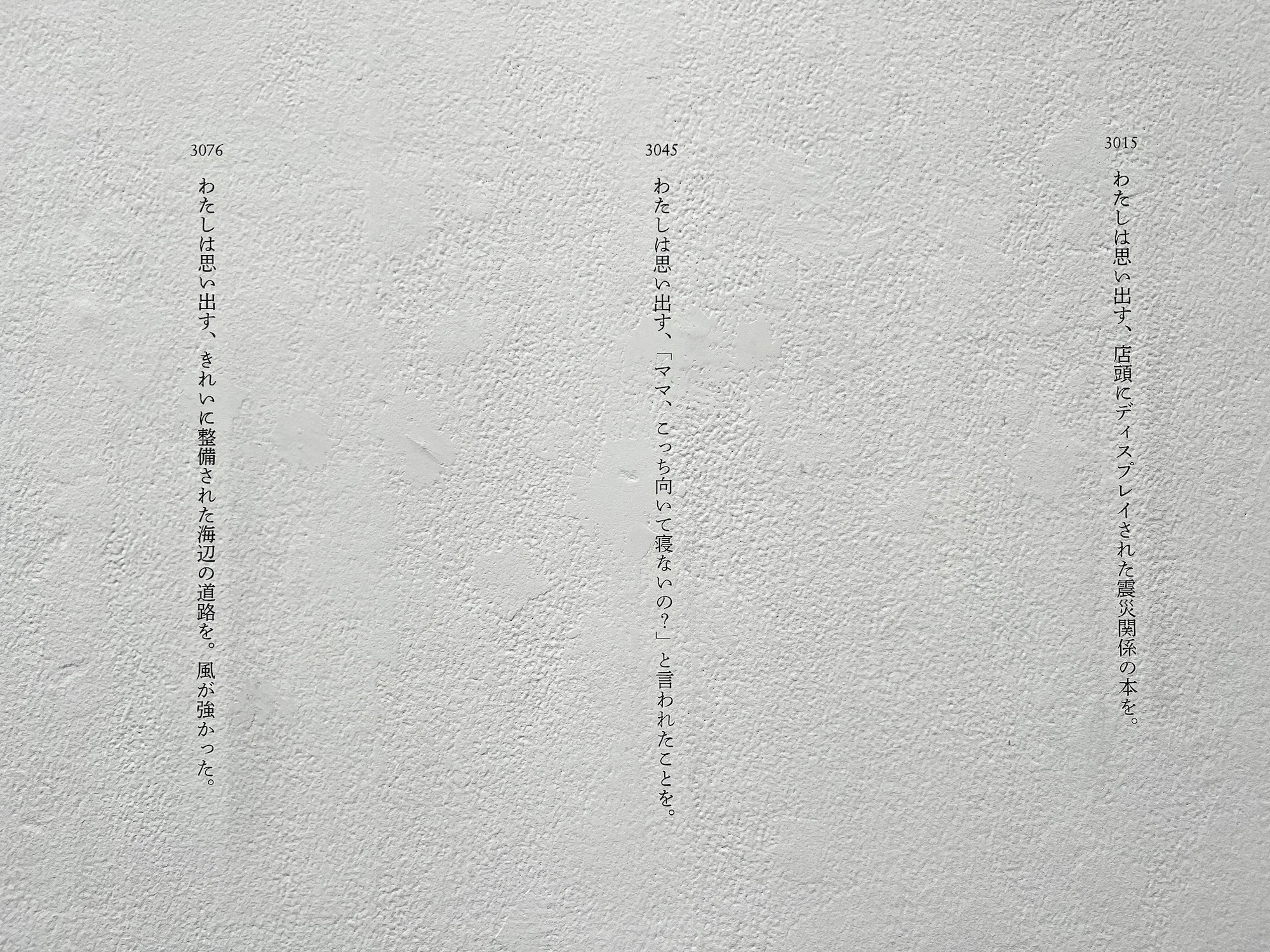 AHAの《わたしは思い出す》(2021)は、2010年6月11日に出産した女性の11年にわたる育児日記を再読し、その回想の一部を再記録化したプロジェクト。壁に書かれた言葉は、子供にまつわる思い出や、震災に関わる思い出などを想起させる。