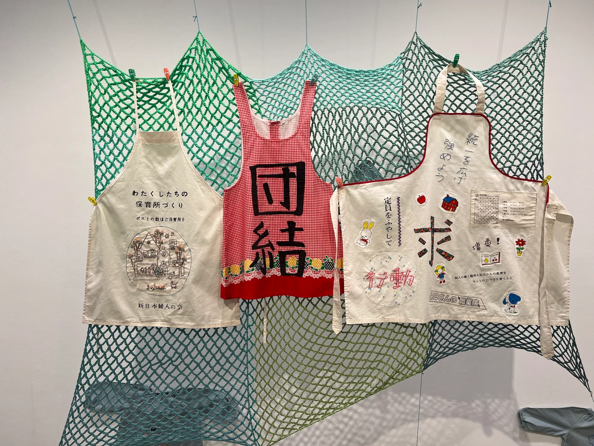 ケア労働は、家庭内や家族のなかに止まらない。その代表的な現場のひとつが幼稚園や保育園だろう。碓井ゆい(1980年東京都生まれ)の《要求と抵抗》は、1972年に愛知県で起こった保育者や園児の環境を守るための運動である港保育園「自主管理保育闘争」に着目し、当事者の声や資料を収集・リサーチして制作された。当時の運動で掲げられていたスローガンなどが、手芸や刺繍といった方法で作品に組み込まれる。「定員をふやして」「保母は消耗品ではありません!」といった切実な言葉は、こうした地道な運動が社会制度のあり方を変革してきた歴史を思い起こさせる。