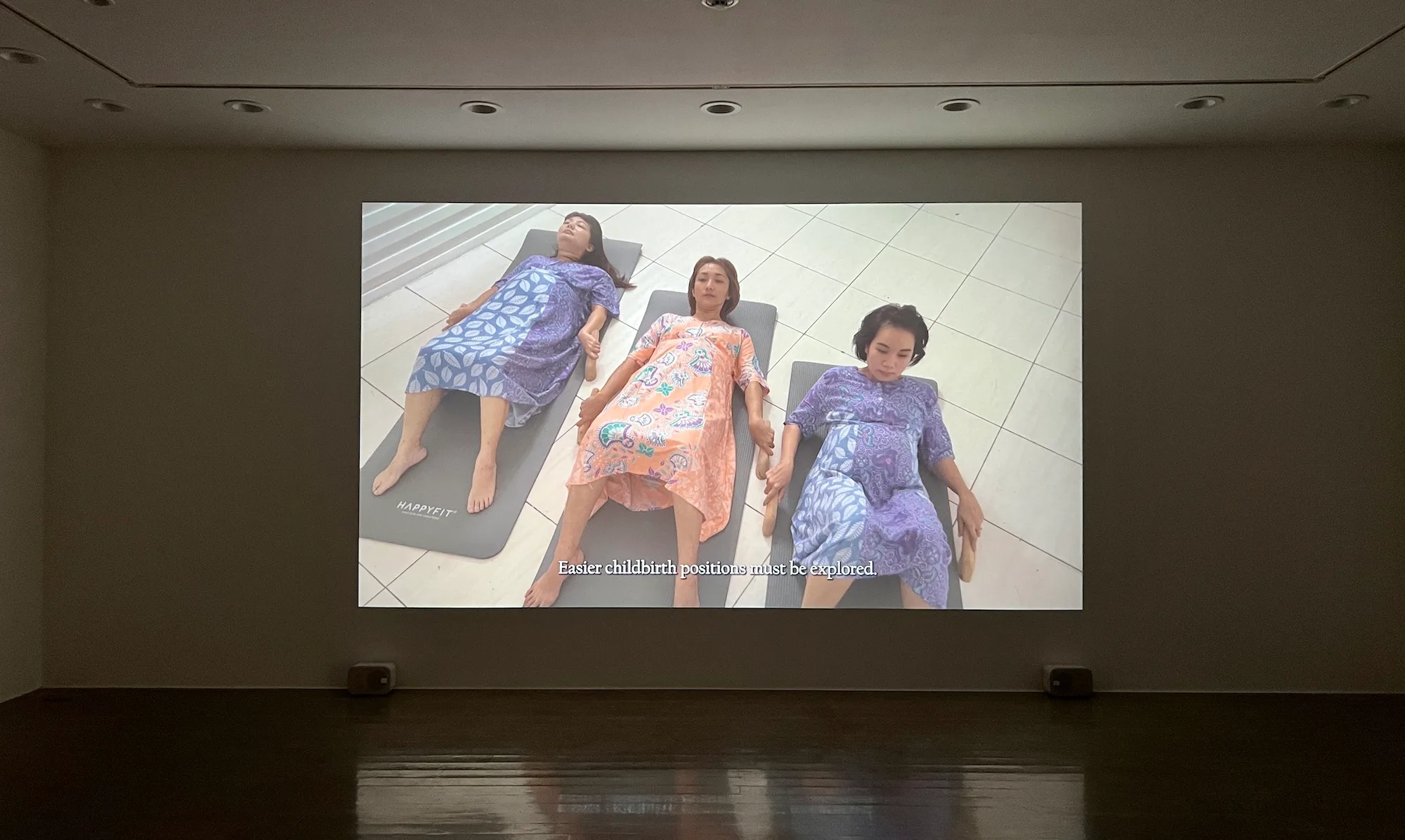 続く第二室には、本間メイ(1985年東京都生まれ)の映像作品《Bodies in Overlooked Pain(見過ごされた痛みにある体)》(2020)。現在インドネシアを拠点とする作家が、妊娠・出産にまつわる同地の風習や社会におけるイメージなどを扱いながら、女性特有の痛みについて問いを発するもの。