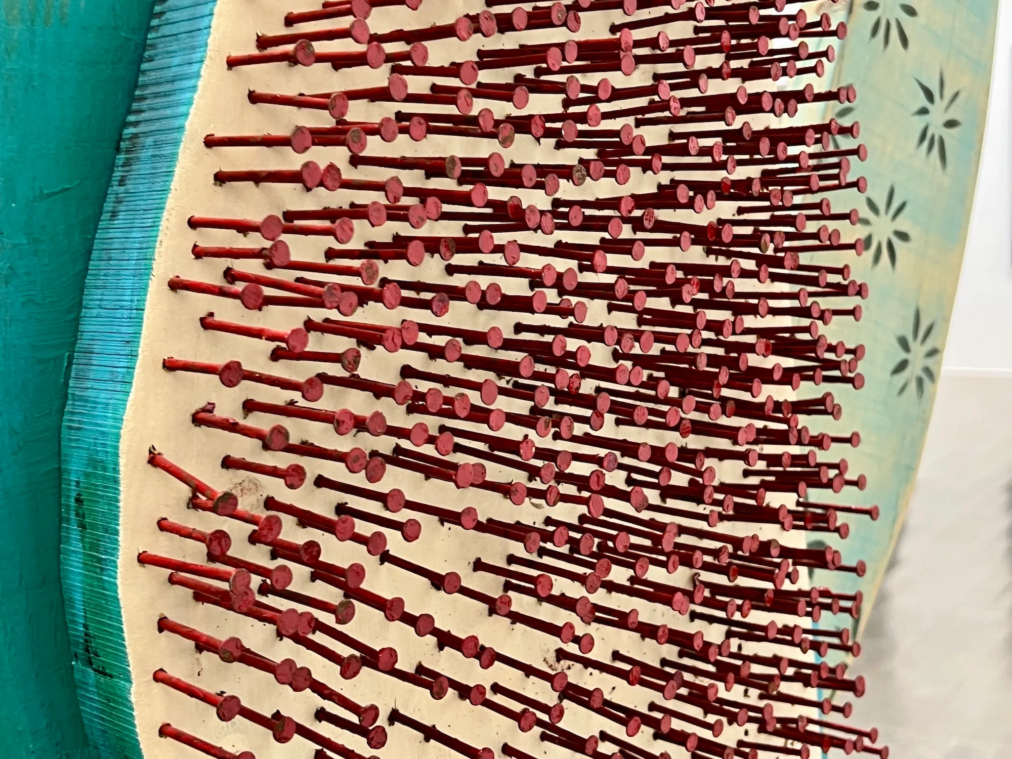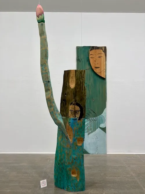 「ユン・ソクナムは40代で子供を育て上げてから、美術の教育を受け直し作家活動をはじめたアーティスト。自分の母親世代は戦争を体験し、自分の時間をほとんど持てなかった。そういった苦しみをテーマに作品を制作してきた。今回展示する《Lotus》(2002)は、女性が芸術家として大成するまでには、どのような痛みに満ちているかを表している。手前はアーティスト自身、後ろは朝鮮王朝時代の著名な詩人で、彼女は芸術家としての志を貫くために非常に苦労をした。その人物が温かいまなざしを向けている。しかし蓮の花を持った作家の像の裏側を見ると、そこにはおびただしい数の赤い釘が刺さっており、芸術家として花を咲かせるまでに伴う苦しみが表現されている」(後藤)。