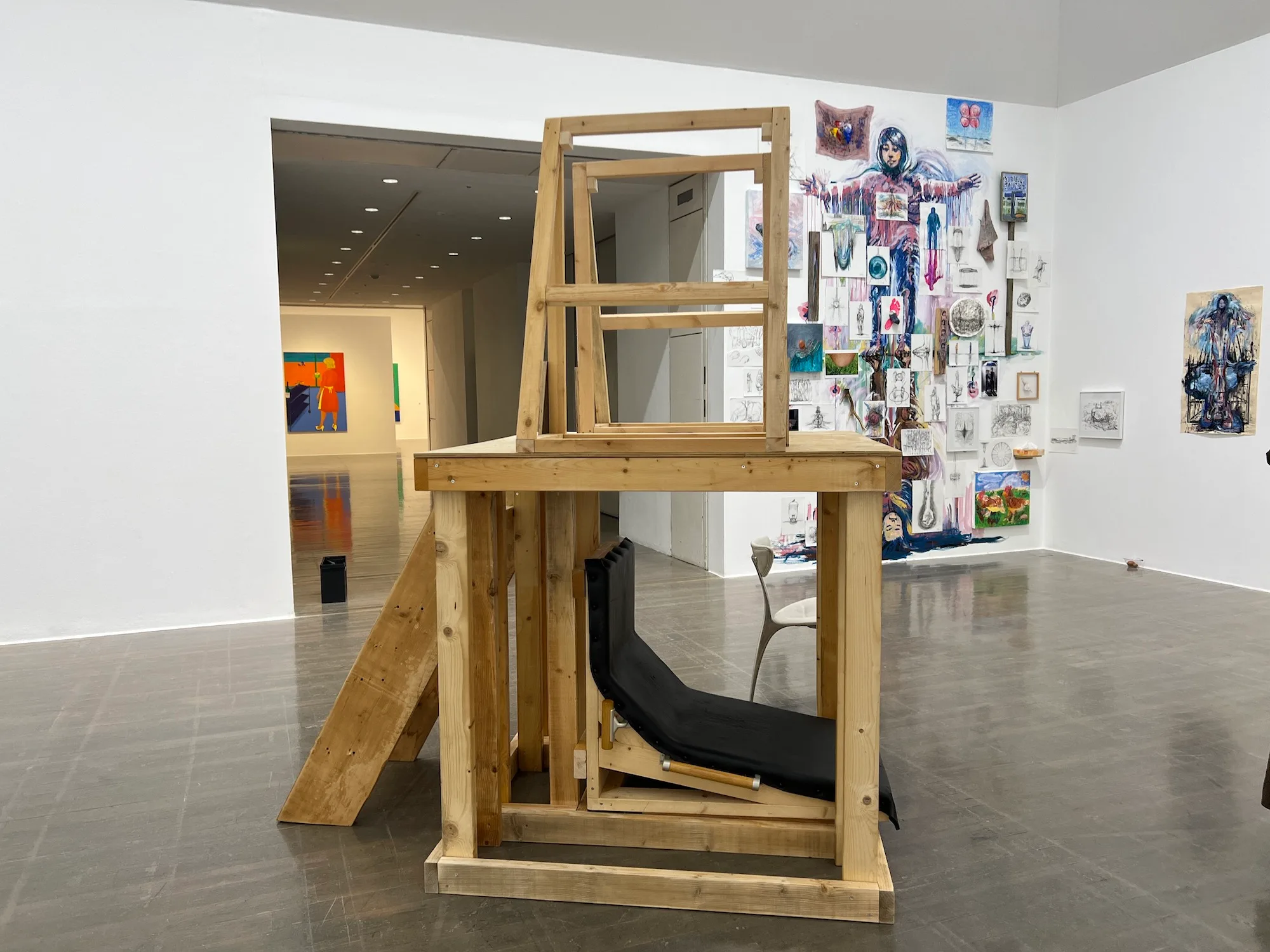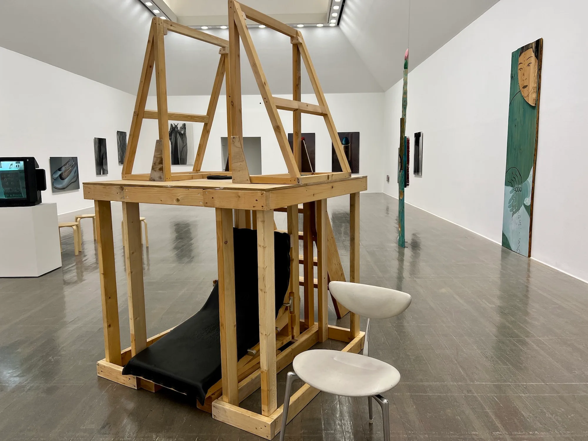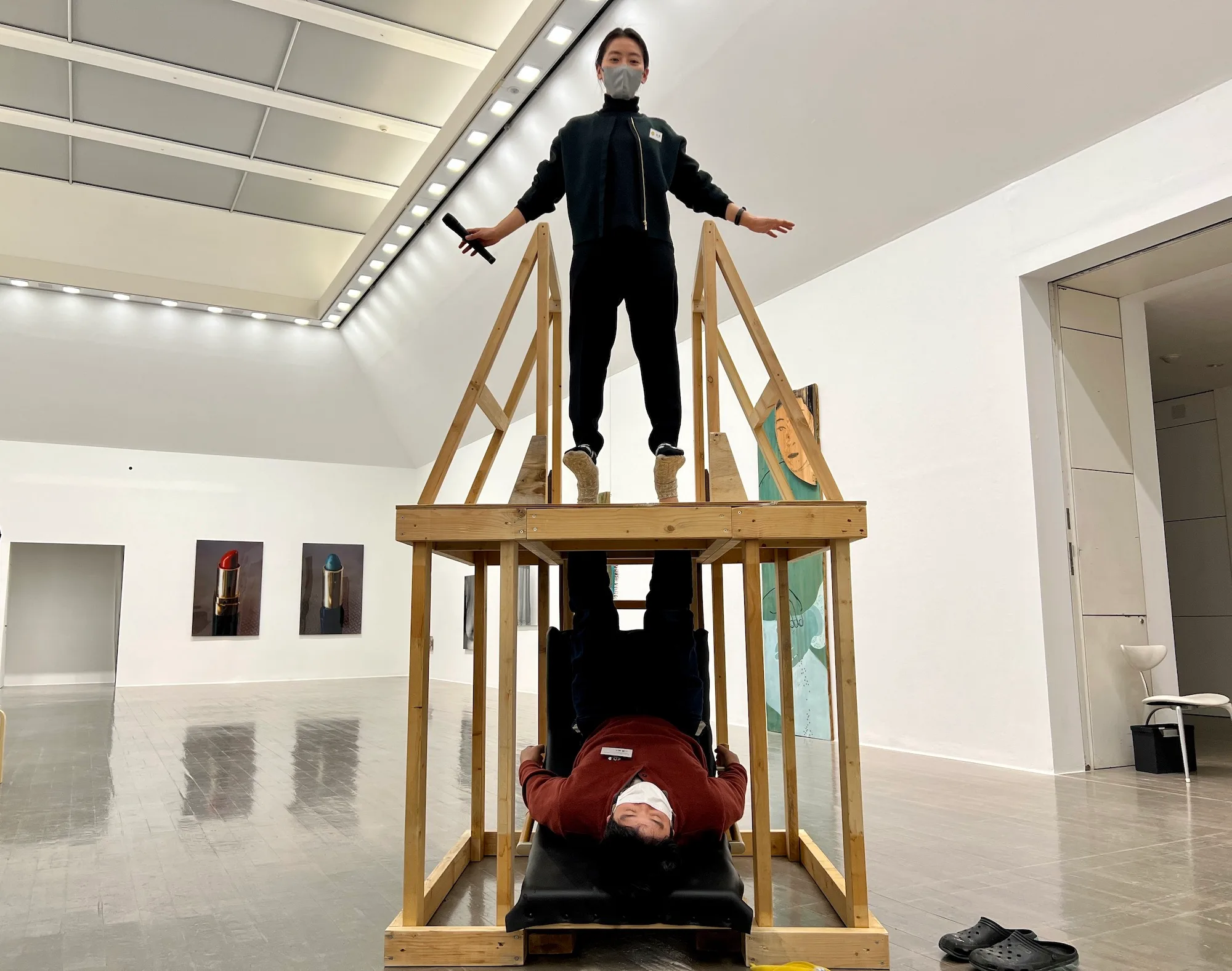最初の展示室に入ると、まず目に入ってくるのが、二藤建人(1986年埼玉県生まれ)の《誰かの重みを踏みしめる》だ。この彫刻的装置は、まず下部に人が入って足を上に突き出し、その上にもうひとりの人物が乗るというもの。学芸員の後藤は、「個別具体的」という言葉を用いながら、本作を展示した意図をこのように語る。
