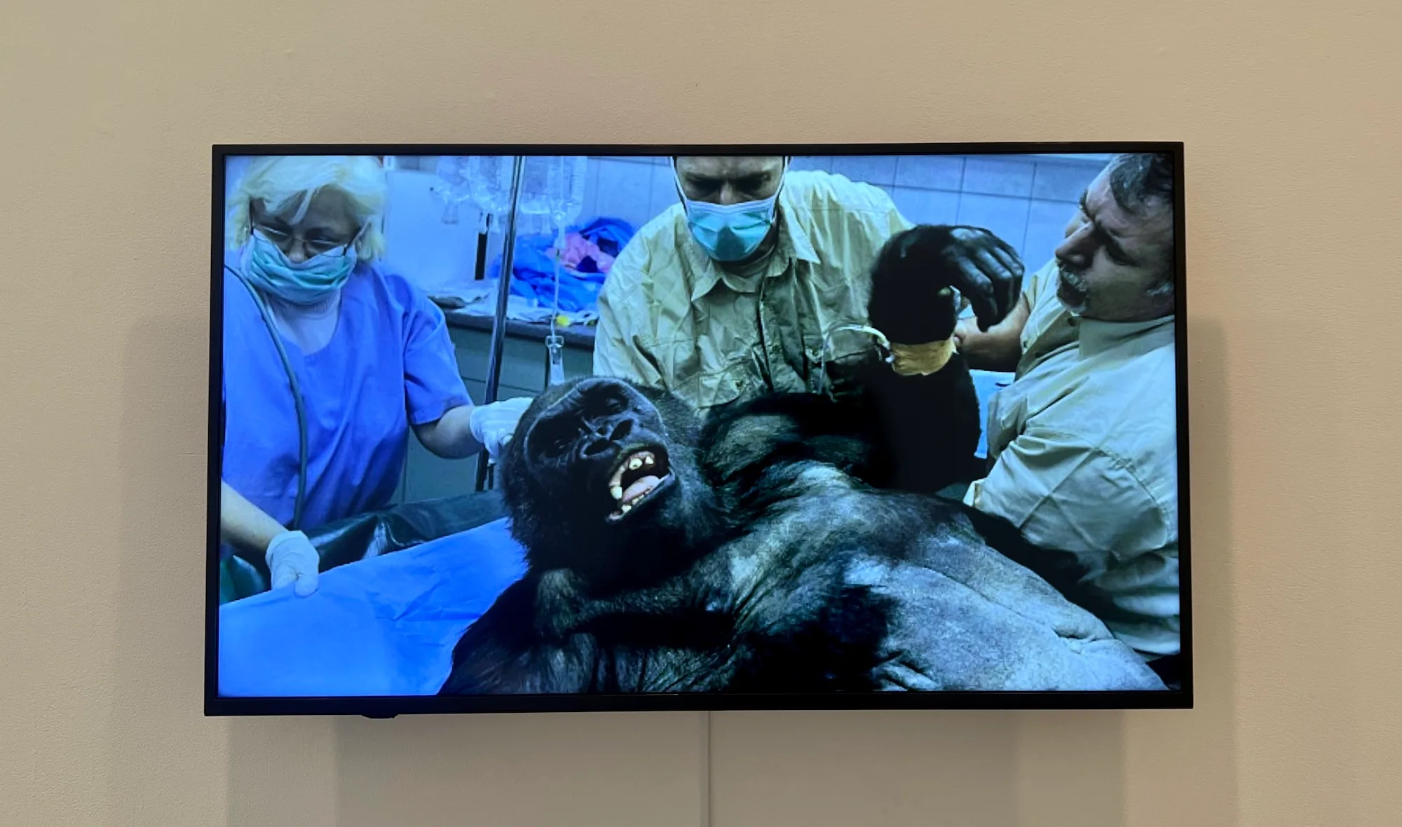 リーゼル・ブリッシュ(1987年デンマーク生まれ)は、ブタペスト動物園にいるメスのゴリラを撮影した《ゴリラ・ミルク》(2020)を展示。この映像作品は、作家と同じ名前を持つこのゴリラの母乳が、研究のために採られて保管されているという事実に衝撃を受けたことをきっかけに制作されたという。出産を繰り返し、おっぱいは垂れ、歯は欠けてしまい、性的な魅力がなくなったゴリラは、いったいどう扱われるのか。
