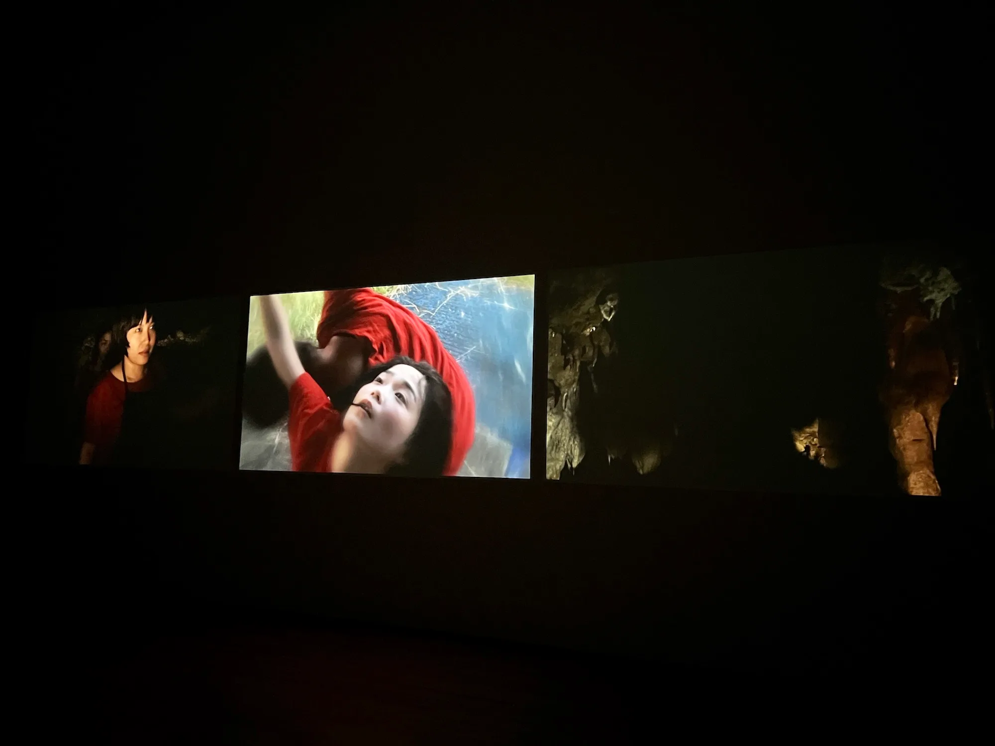 写真作品《コロスの唄》(2010)のあいだを通り、その奥には《肉屋の女》(2012)。3面プロジェクションによる映像インスタレーションで、米軍基地敷地内の黙認耕作地に実在した闇市や、鍾乳洞を舞台に抽象度の高いストーリーが展開される。