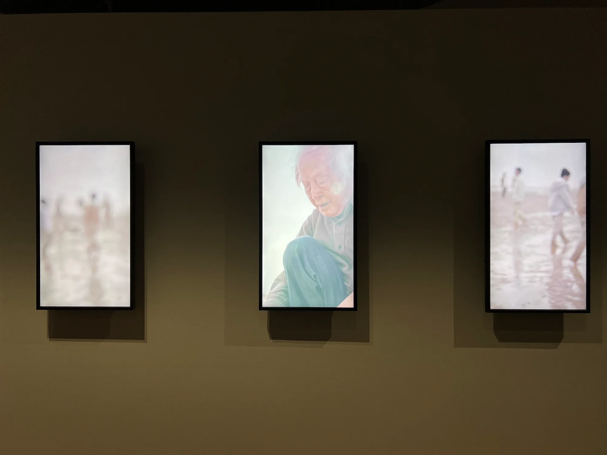 しかしいまは、「忘却」ということに作品を通して向き合っていることに興味をひかれた。《ベラウの花》に続いて展示されている《彼方》(2022)も、過去の記憶を忘れていく父の姿から着想を得た作品だ。子供から大人まで様々な人々がいる浜辺のような場所に、ひとりの老人が佇んでいる。その目はここではないどこかを見ているようで、周りの人々とは違う時空間に存在しているような雰囲気がある。