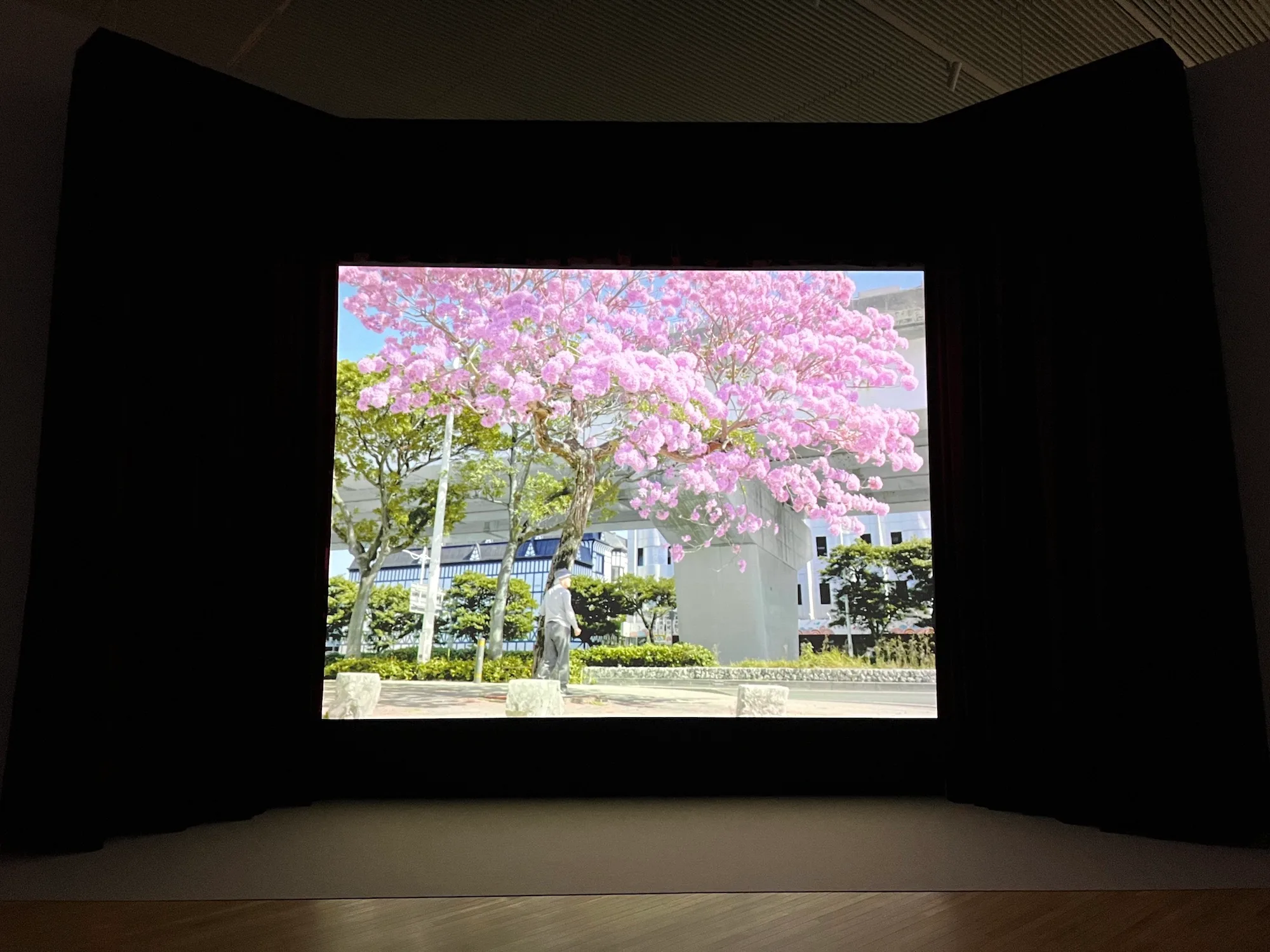 左が《チンビン・ウェスタン 家族の表象》(2019)、右が《ベラウの花》(2023)。スクリーンに映っているのが「ベラウの花」ことホウオウボク(鳳凰木)の花