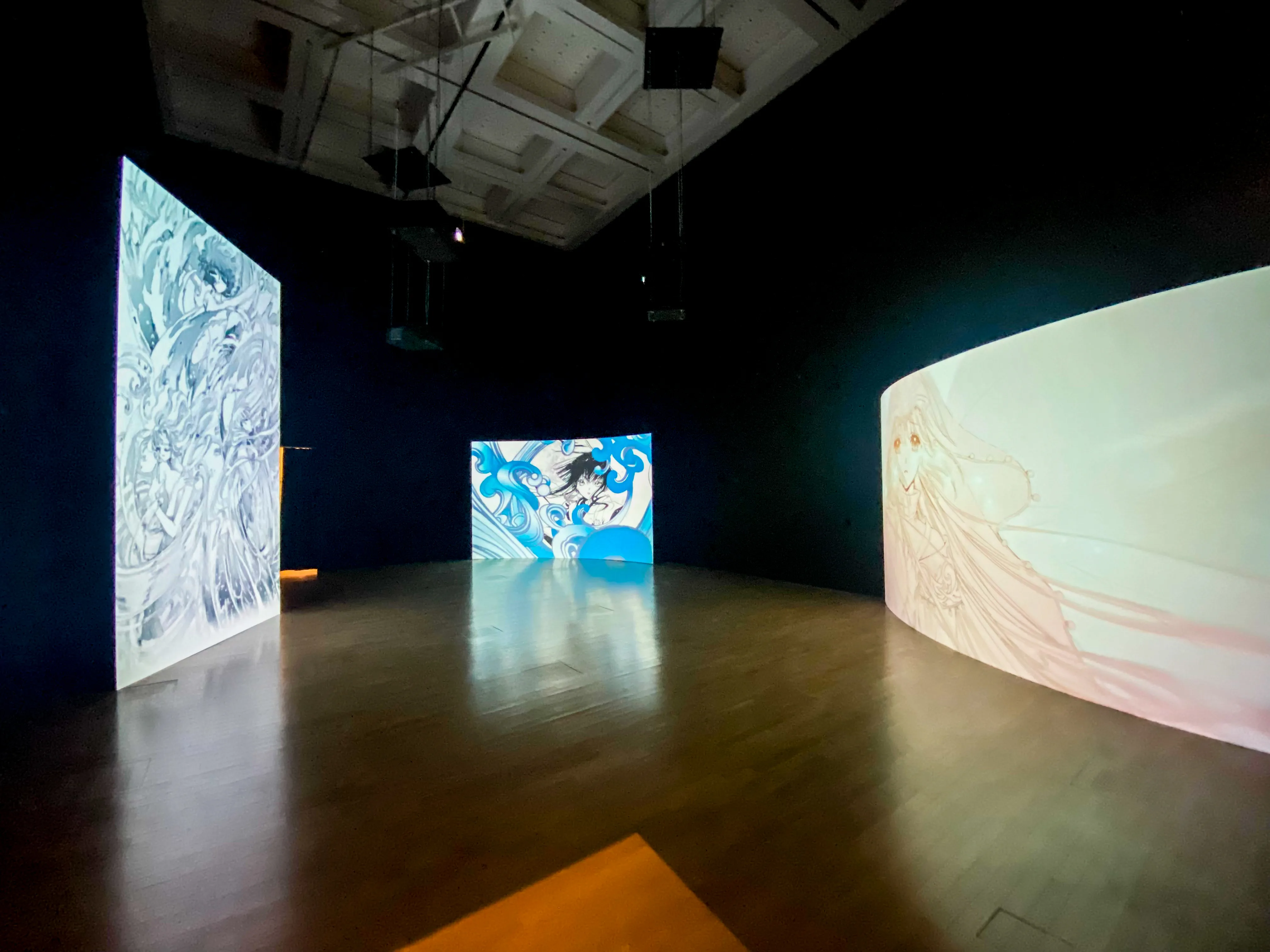 さらに「MAGIC」のエリアには、CLAMP作品を読んだときの「魔法にかけられたような体験」を表現したという映像展示が登場。ファンタジーや魔法、不思議な力を描いた作品から、3つの大きなスクリーンに数々のキャラクターが映し出され、来場者が作品のなかに入ったような没入感を演出する。