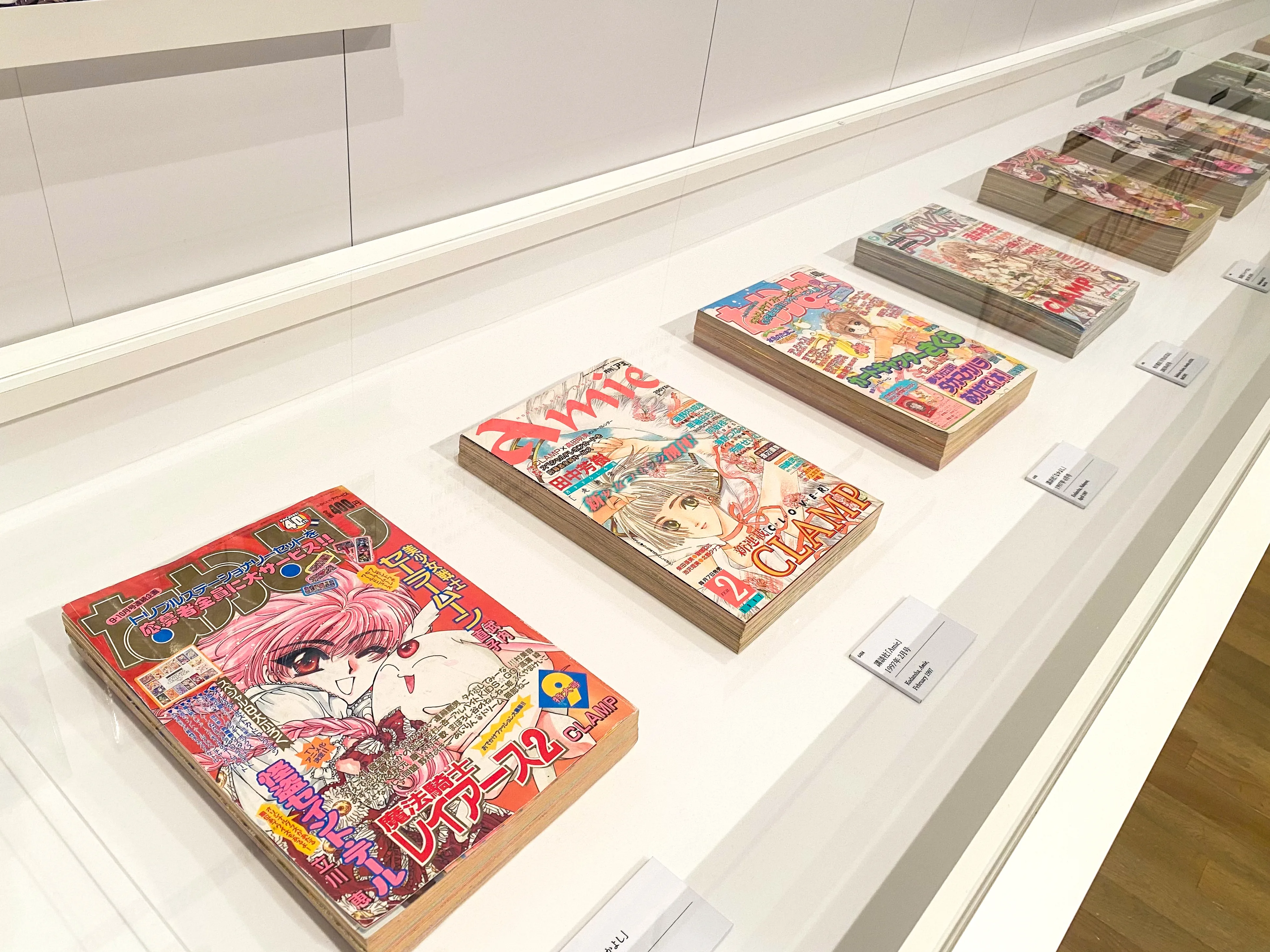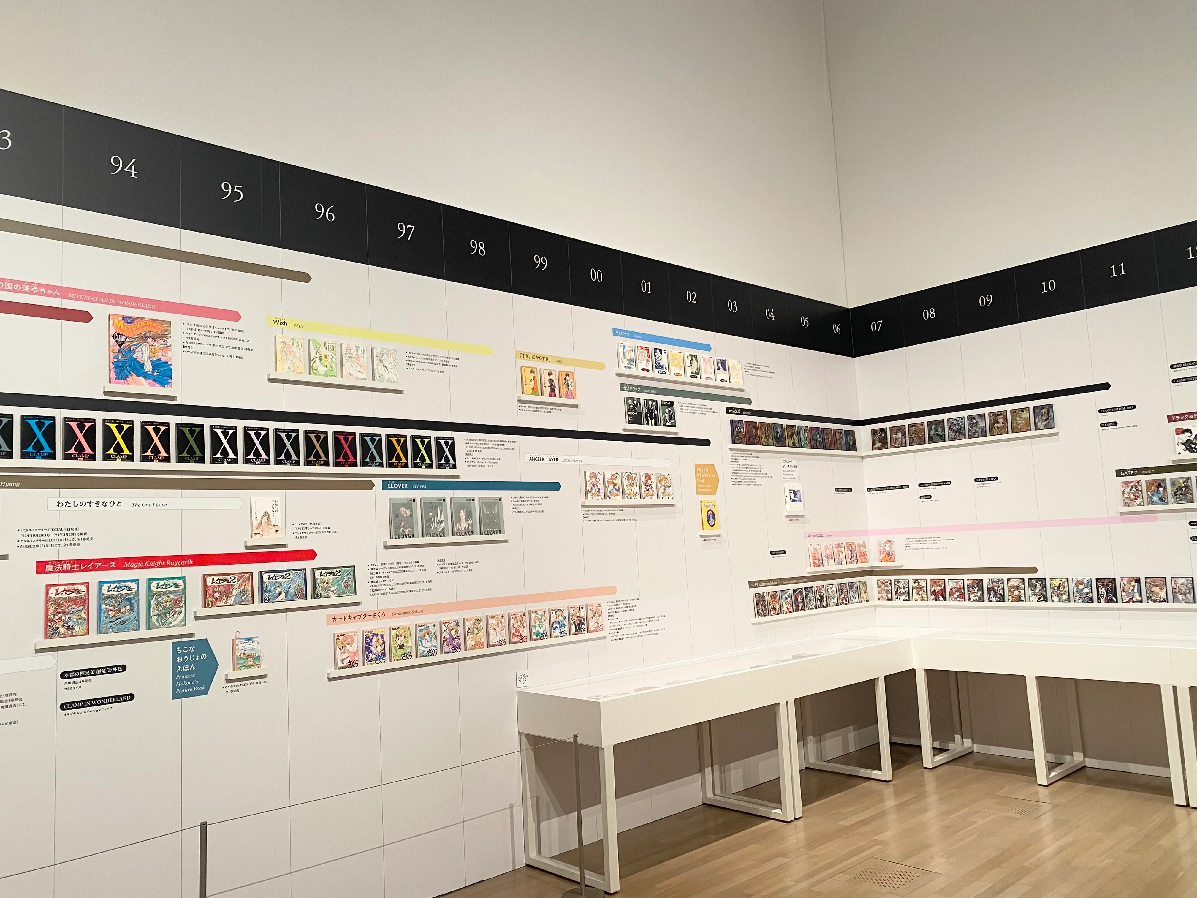CLAMPの35年間の創作活動を総覧できるエリア「IMAGINATION」には、各作品の連載時期など、1989年から2024年までの画業を視覚化した巨大年表をはじめ、『なかよし』などの過去の掲載誌、英語版の単行本など関連資料が並ぶ。展示室の中央には、本展のために行われたCLAMPへのインタビューをもとに、その言葉を記したインスタレーションが展示されている。