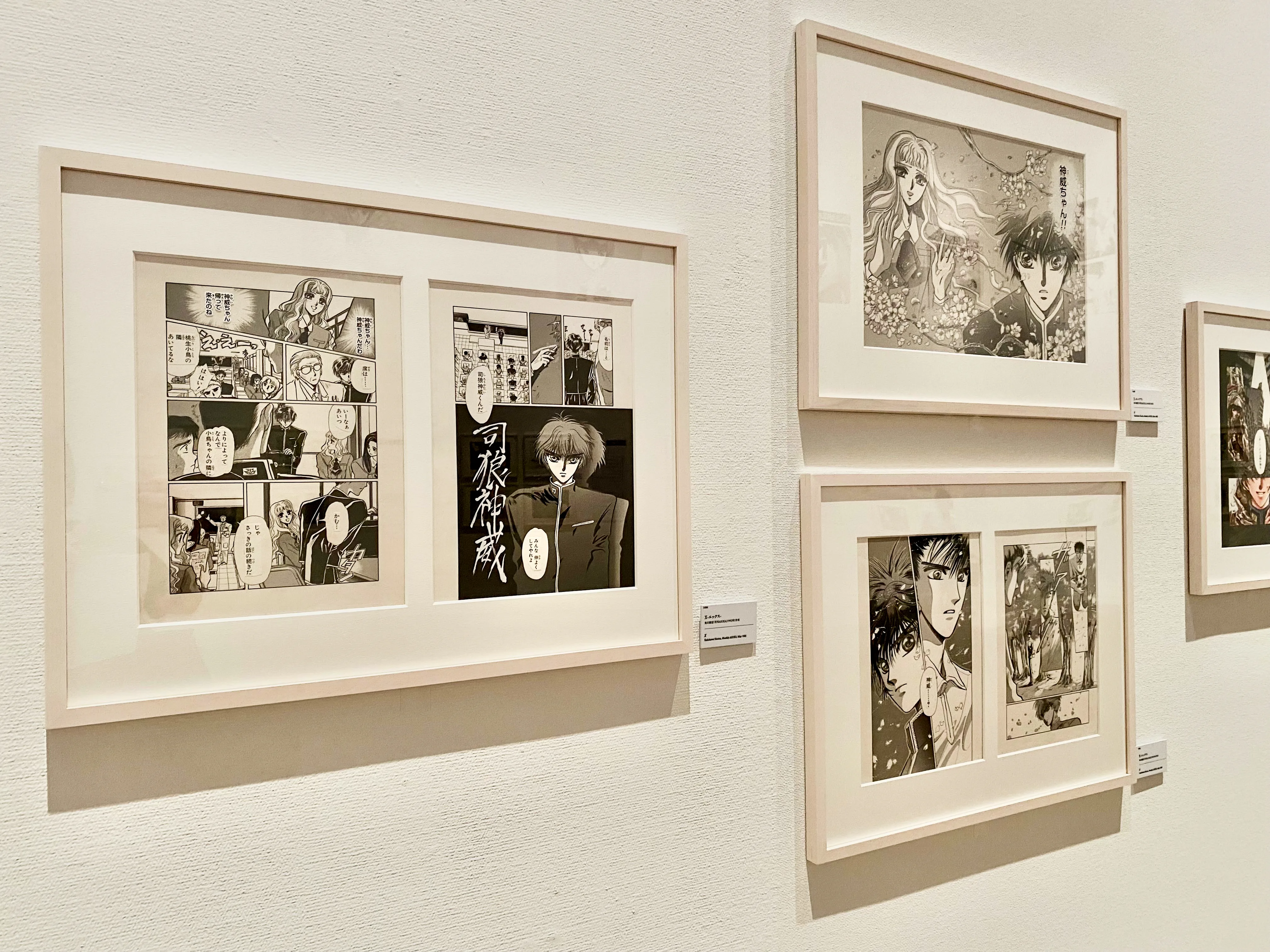 作品ごとに展示されたイラスト群からは、カラーインクを使用した初期の作品に始まり、1990年代からマンガ界に広まり一早く取り入れたというコピック、さらにはアクリルガッシュやパステル、墨、デジタル作画など、作品のテーマや世界観にあわせて、多様な画材や表現技法が用いられてきたことがわかる。エアブラシを使って大胆な構図で描いた『聖伝-RG VEDA-』とカラースクリーントーンを使用したスタイリッシュな『東京BABYLON』など、同時期に発表された作品のイラストを見比べて鑑賞できるのもポイントだ。時代や掲載誌による画風の変化も感じることができる。