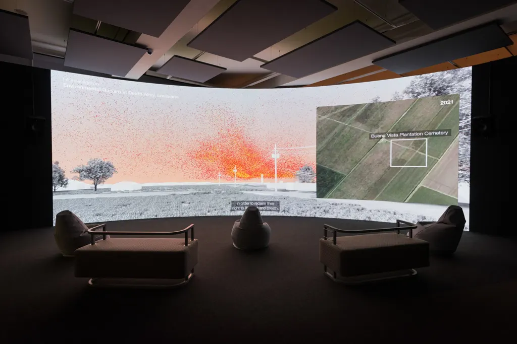 また、フォレンジック・アーキテクチャー(Forensic Architecture)によって制作された《Cloud Studies》は、雲や空気という存在が、自由に国境を越えることができる唯一の世界共有資産とみなされながらも、同時にその流動性が「隣人」の攻撃に巧みに利用されてきたという歴史の二重性に光を当てる。アメリカ、ルイジアナ州にある「死の通り」についての捜査(*4)では、現在も住民を苦しめるガンのリスク/環境汚染が、300年にもわたる黒人コミュニティの搾取と、その記憶を上書きするように建設されたサトウキビの工場によってもたらされていることが3DCGを用いて可視化される。フォレンジック・アーキテクチャーは、自身のコレクティブが必ずしも同様の批判を免れないことを自覚しつつも、こうした植民地支配や奴隷制度の延長としてもたらされる支配の形態を「Environmental Racism(環境型人種差別)」として繰り返し名指しするのだ。