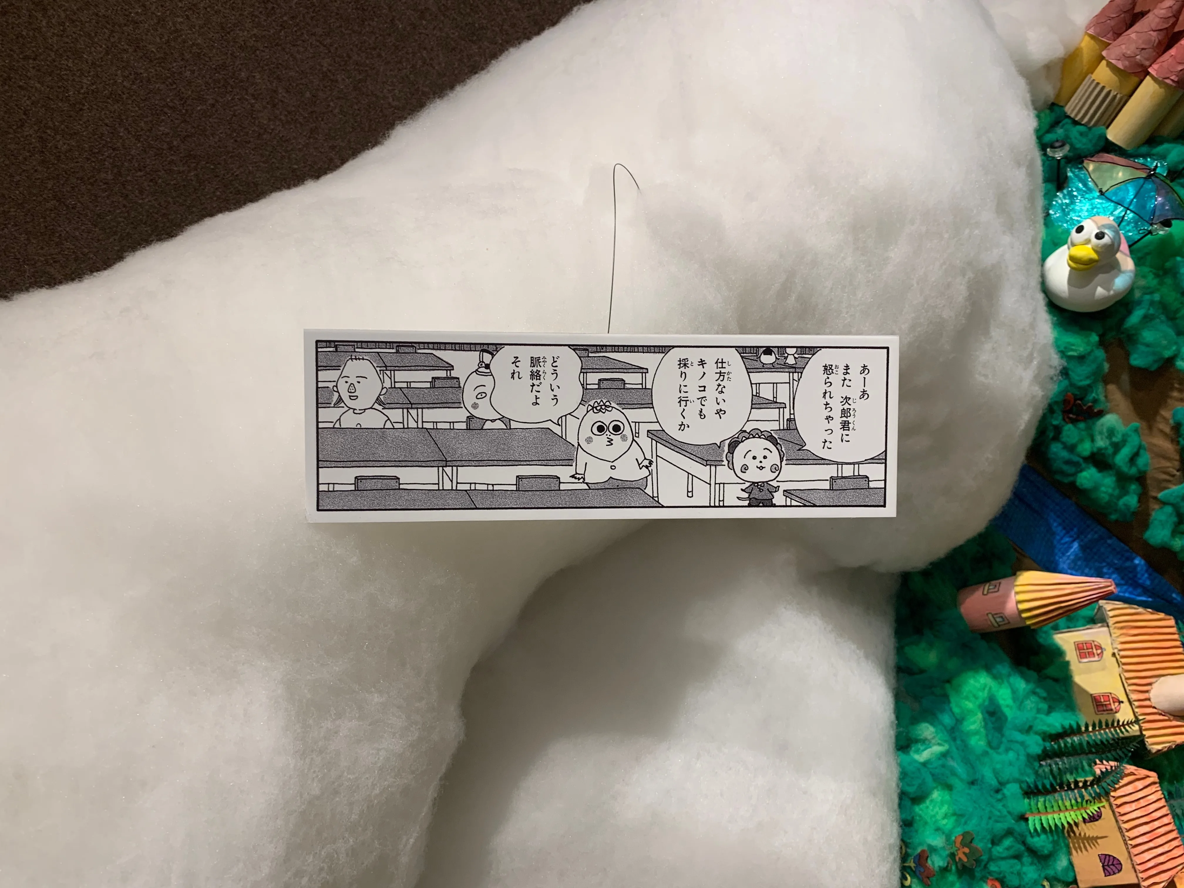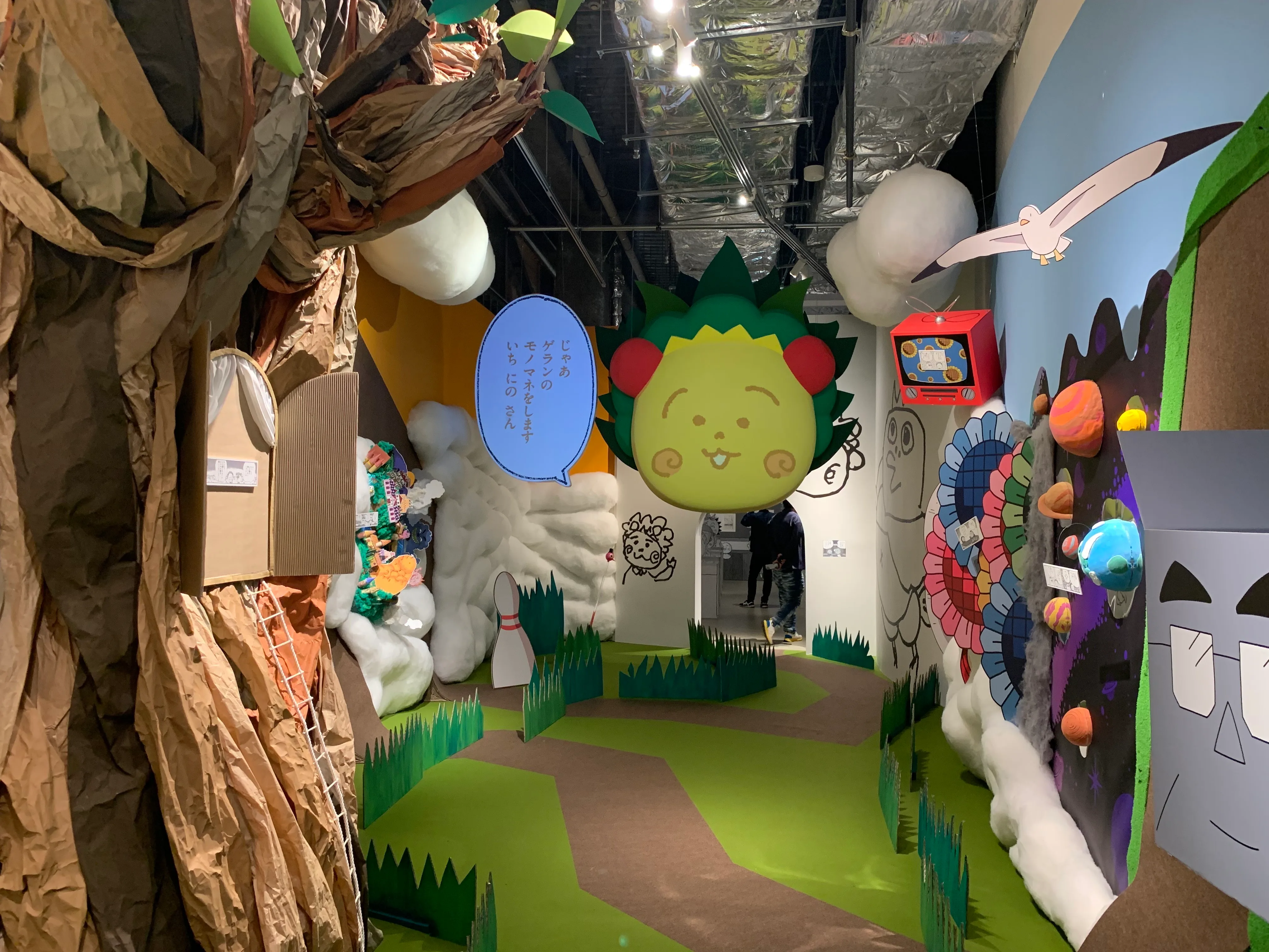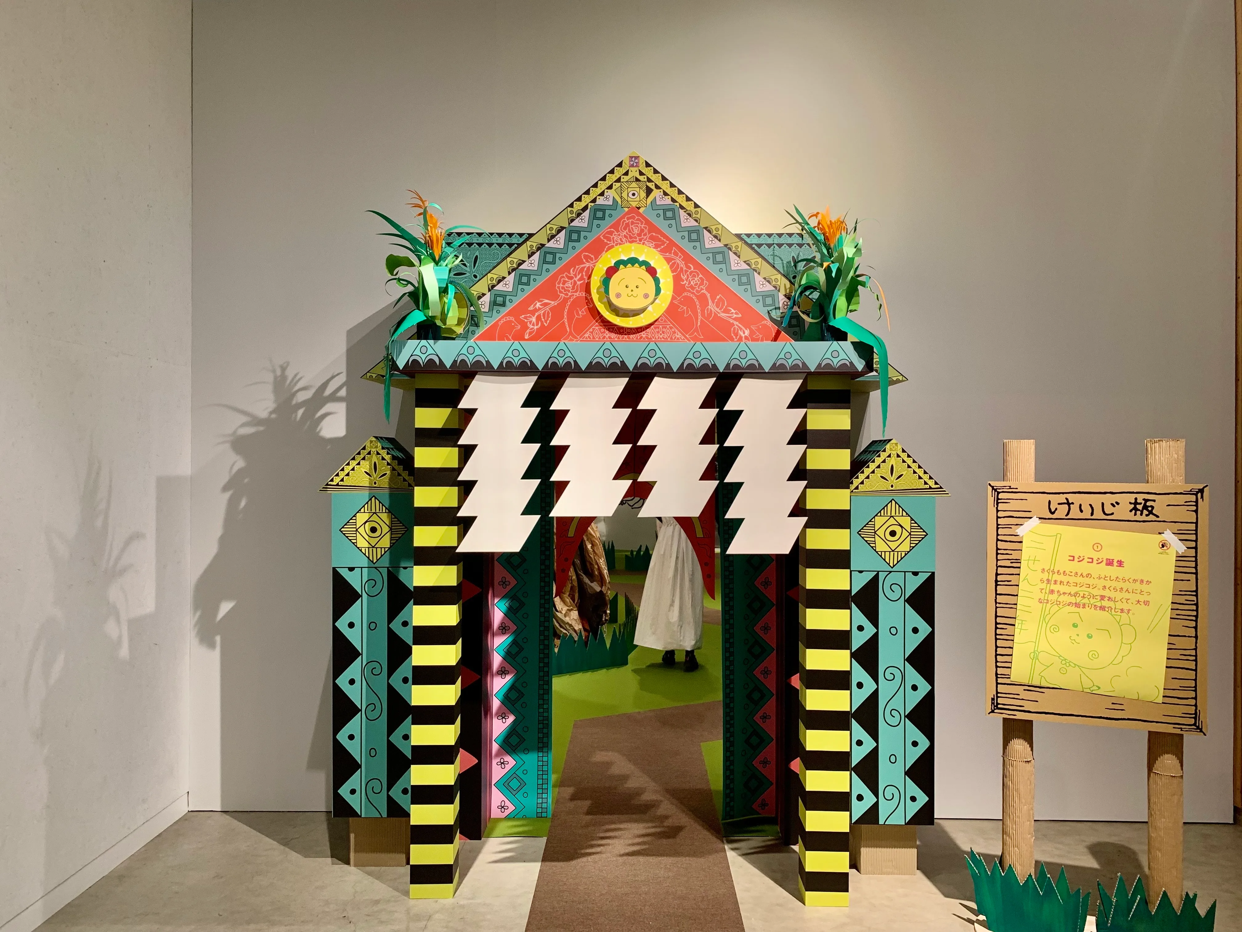 胸ほどの高さの鳥居を潜ると、「ギャグ50連発」がお出迎え。コジコジがトンチンカンなことを言うマンガのシーンが散りばめられた空間だ。奥に控えるモニターでは、コジコジのギャグと変顔が炸裂している。ギャグと一口に言っても、その種類は様々。ボケやツッコミはもちろん(大抵コジコジがボケて、次郎がツッコんでいるのだが)、言い間違いや聞き間違い、ポエムや歌詞まで、コジコジの多彩さ(?)が光る。