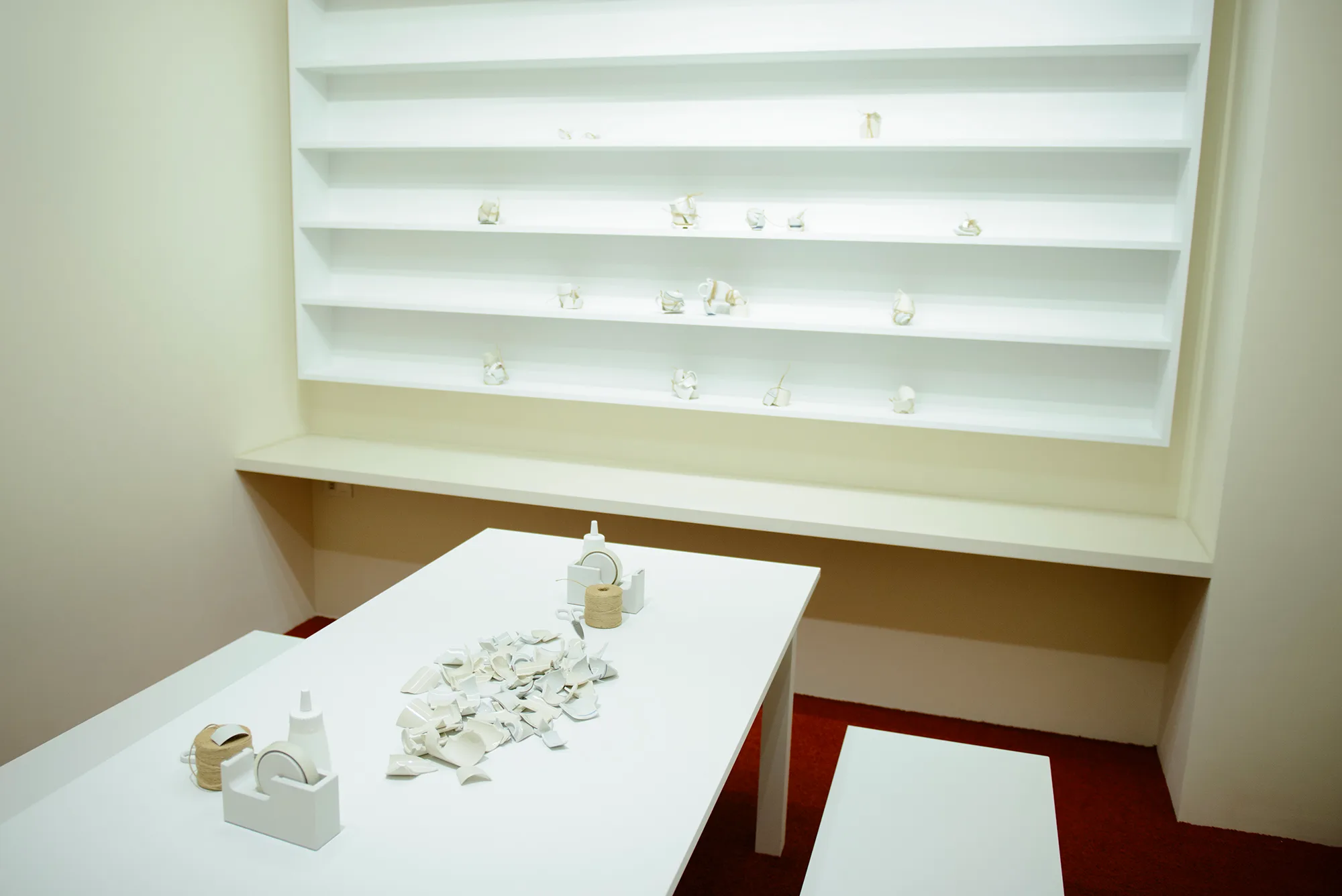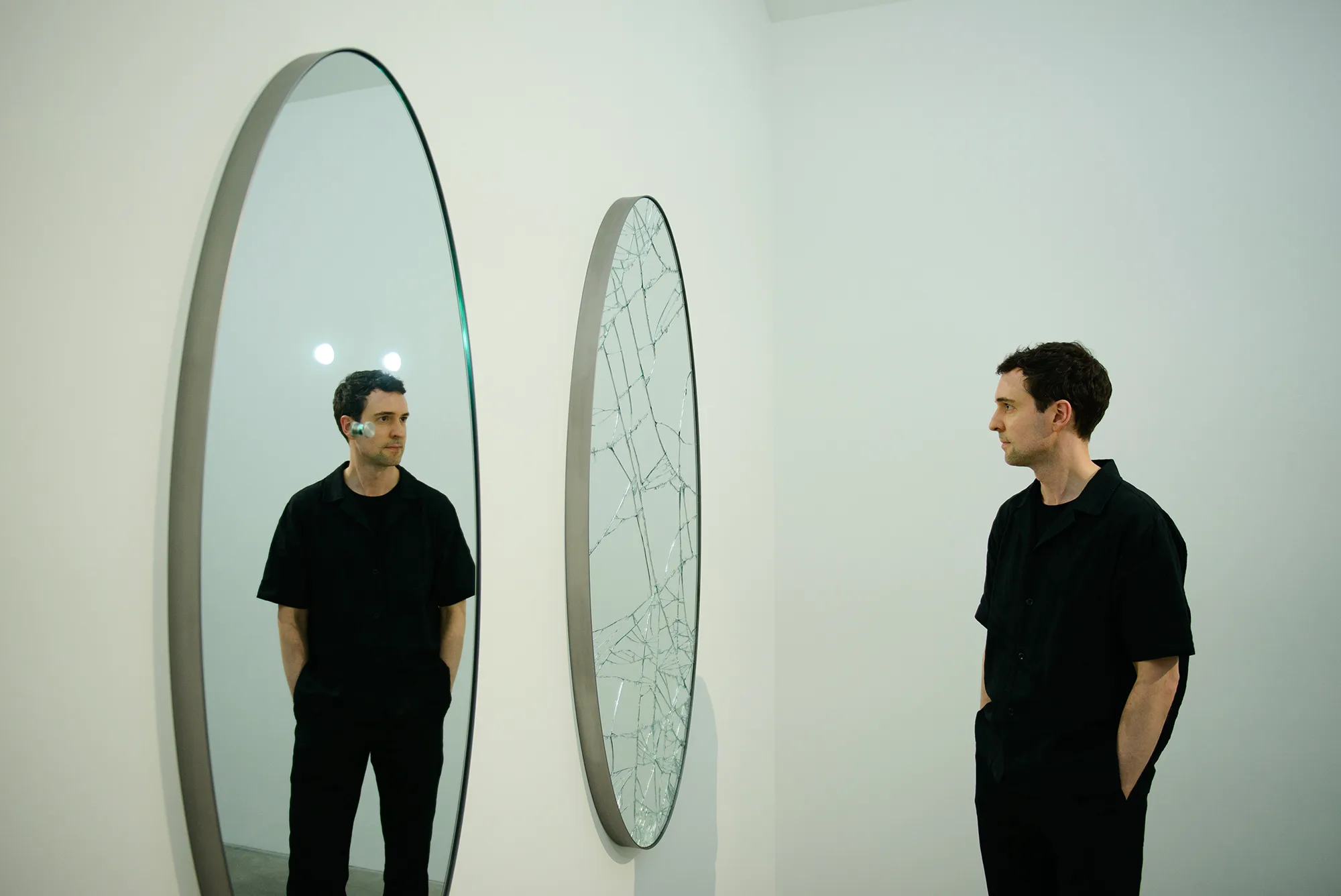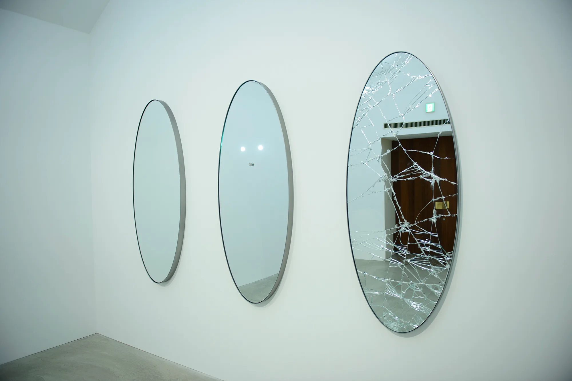 ヨーコに代わってこの作品の意図を話すのは難しいですが、私はこの作品の形態とタイトルから、過去・現在・未来のことを思い浮かべました。シンプルな鏡と、明滅するライトが埋め込まれた鏡、割れた鏡で構成される作品です。割れた鏡には、ネガティブなイメージもあるかもしれませんが、ヨーコがそれまでもテーマとしていた「Mending(修復すること)」も連想させます。直すことで、そこから新たなイメージを生み出す、あるいはそこに自身の新たな姿を映し出す。そんな可能性もあるかもしれません。この作品を入口に展示することで、これからヨーコの作品を見る前に来場者が自分自身を見つめることができる。それは、エキサイティングな機会になると考えました。