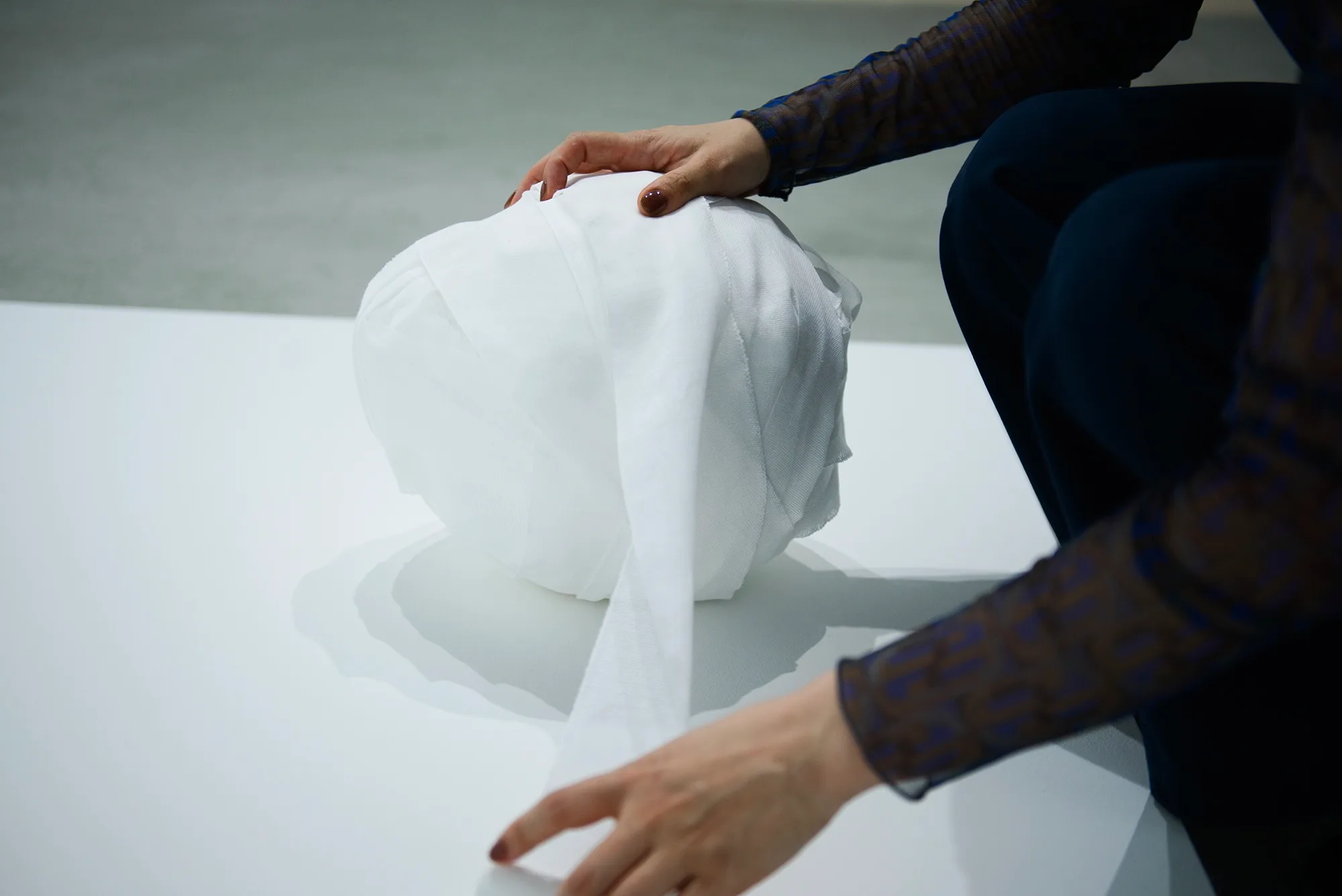 そしてもうひとつの軸が、フィジカルな参加を促す表現です。こちらも彼女の活動初期から重要な要素のひとつで、そのような来場者の作品への物理的な参加を促す2点を天王洲で紹介しています。来場者が包帯を球体状に巻くことで立体が大きくなっていく《Wrapping Piece》と、白いキャンバスに丸を描くことで絵が変化していく《Draw Circle Painting》です。