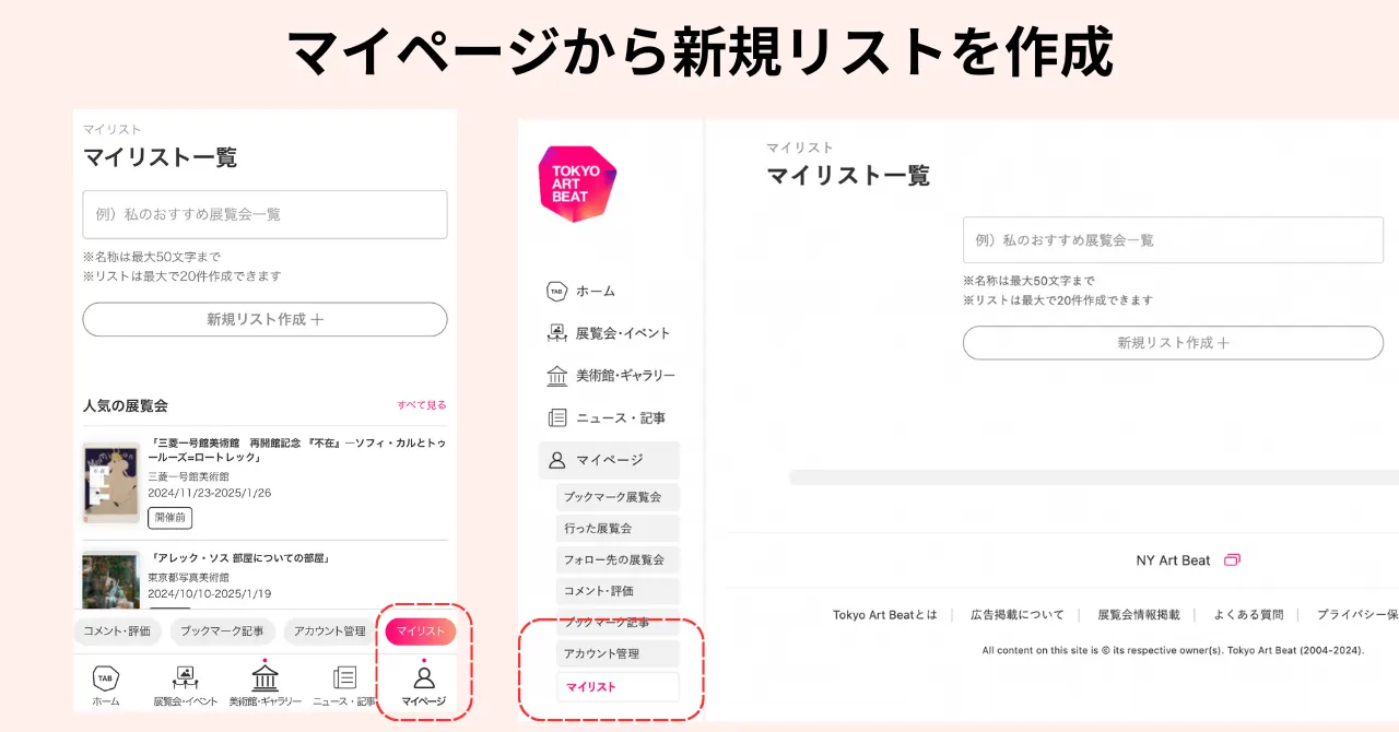 Tokyo Art Beatにログインまたは会員登録し、メニューバーにあるマイページから「マイリスト」を選択します。リストの名前を入力し「新規リスト作成」を選択すると空のリストが作成されます。