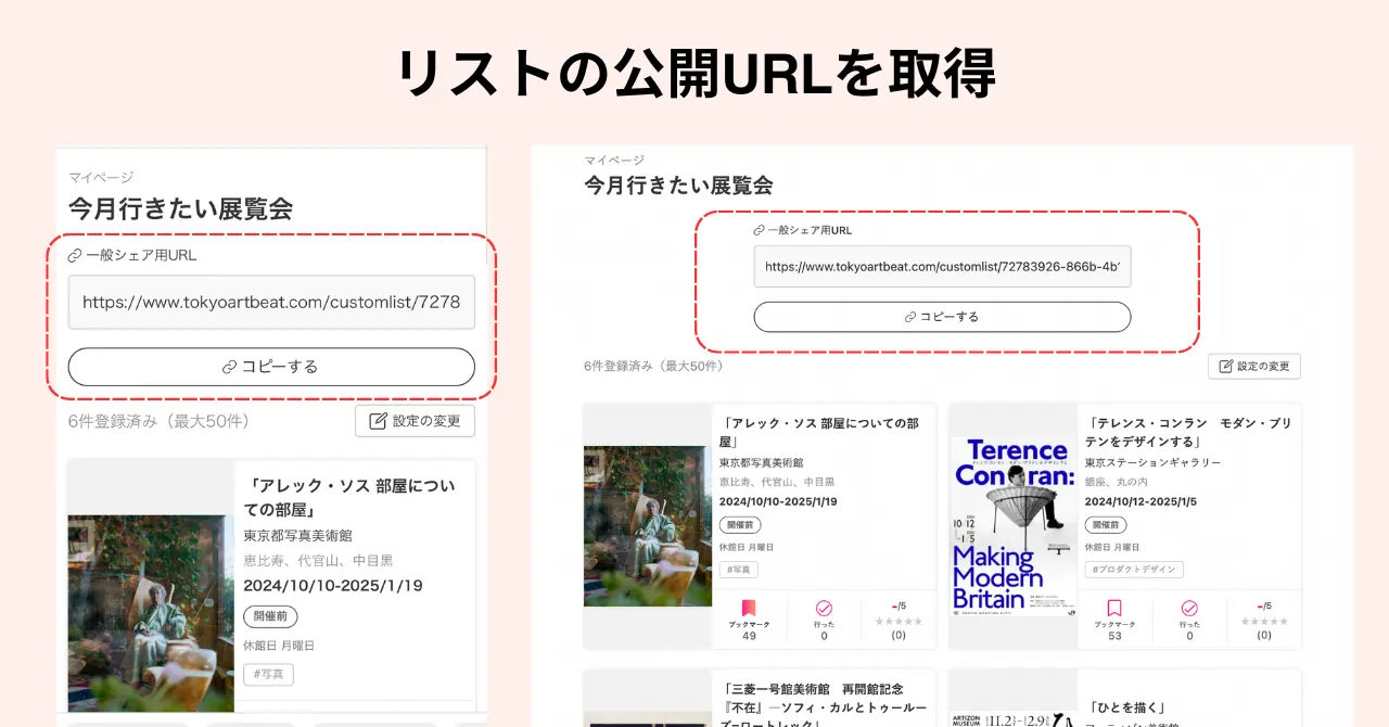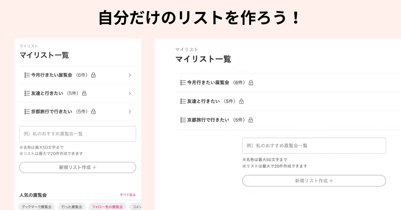カスタムリスト機能を使えば、気になる展覧会を任意のリストに振り分けて管理することができます。リストは最大20個まで作成可能。一つのリストにつき最大50件の展覧会を追加できます。
