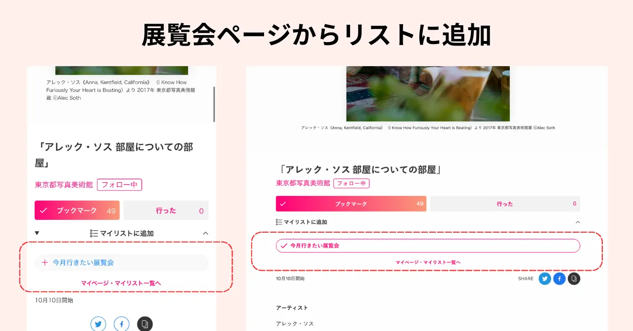 リストに追加したい展覧会の詳細画面を開き、ブックマーク・行ったボタン下に表示されるリスト名を選択することで追加できます。リストの一覧や詳細はマイページ内の「マイリスト」からご確認いただけます。