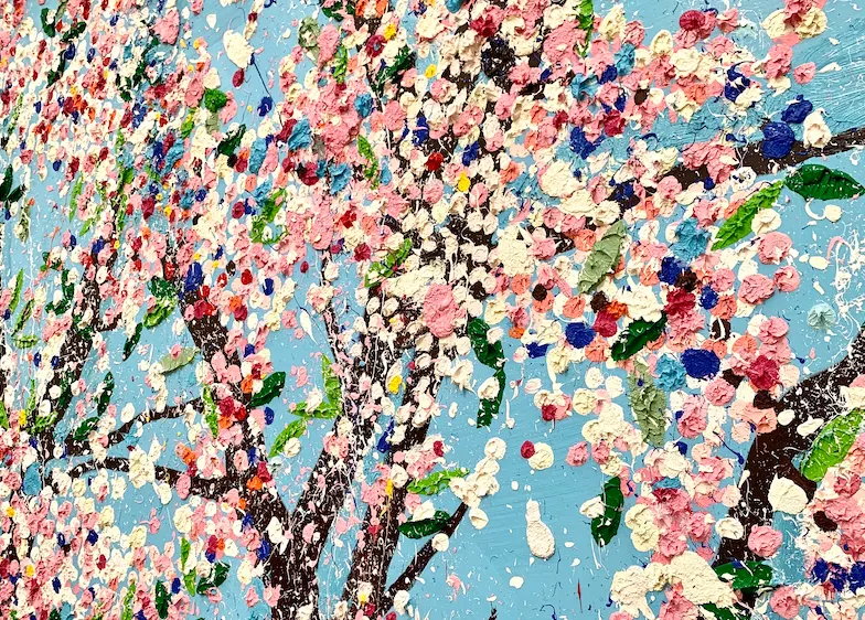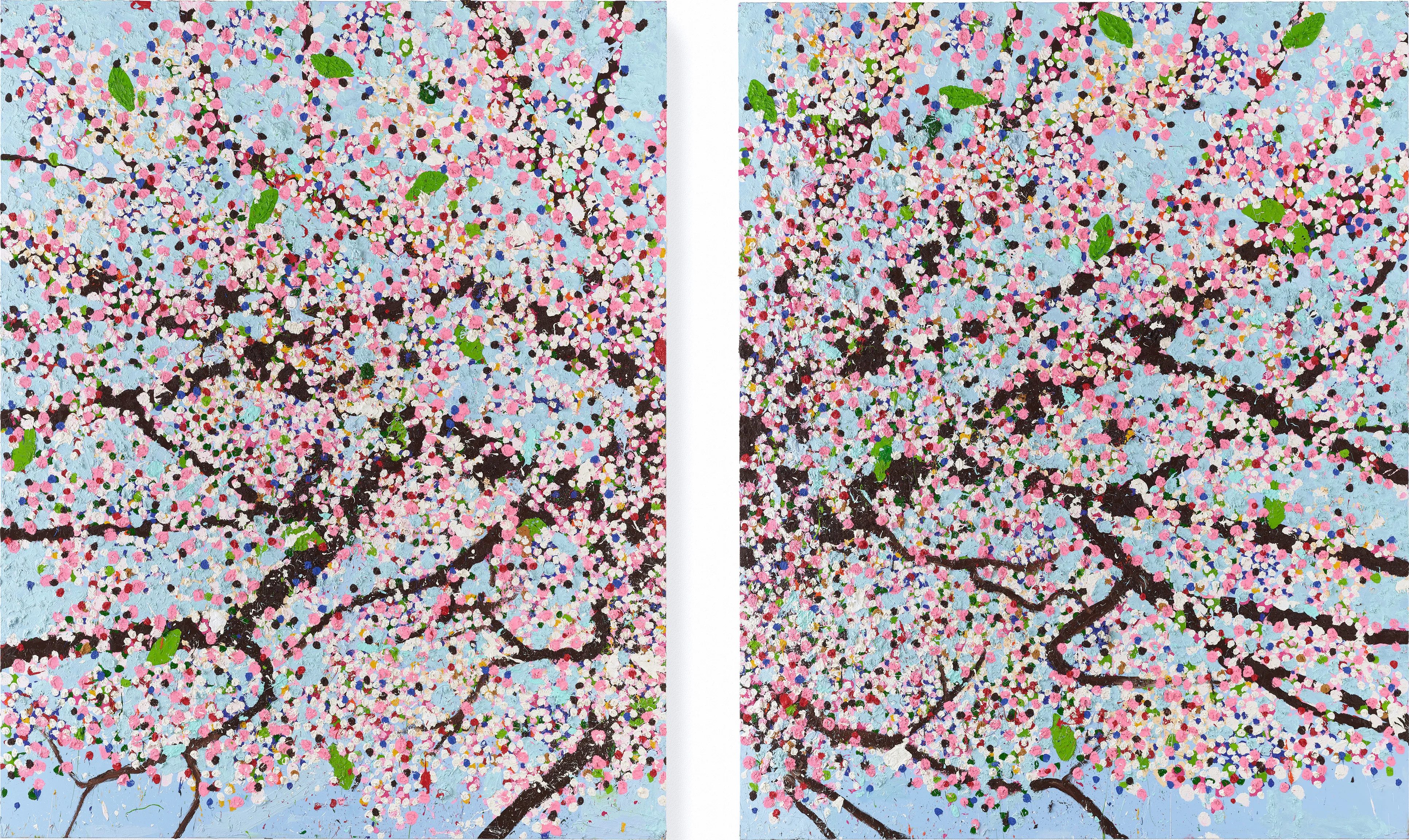 そしてこの「CHERRY BLOSSOMS」である。このストレートな激情がほとばしる巨大な連作について、ハーストのインスタグラムのアカウントには、2019年から制作過程がアップされ続けてきた。絵画の“野暮ったさ”を受け入れる覚悟を決めたのだろうか、絵具だらけになりながら、精力的に絵筆を振るう彼の姿は、懐かしい画家たちの身振りを思い出させ、ちょっと感動的だった。巨大な画面に没入感を与える機能を実装させるべく、色彩が及ぼす効果の検討がされたようだ。また、樹木の断片を見せることで、画面の外にまで広がる樹木の全体までを想起させる企みは、鑑賞者の既視感を起動させる装置としての機能だ。