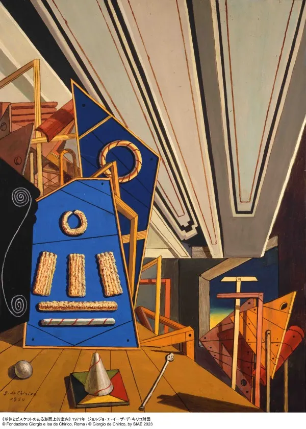 「形而上的室内」は第一次世界大戦の勃発により、フェッラーラの病院に配属された彼が、この町の家の室内、店先のショーウインドウなどに魅せられて描いた室内画だ。線や四角、箱、地図、ビスケットなどのモティーフを組み合わせて構成されているのが特徴だ。