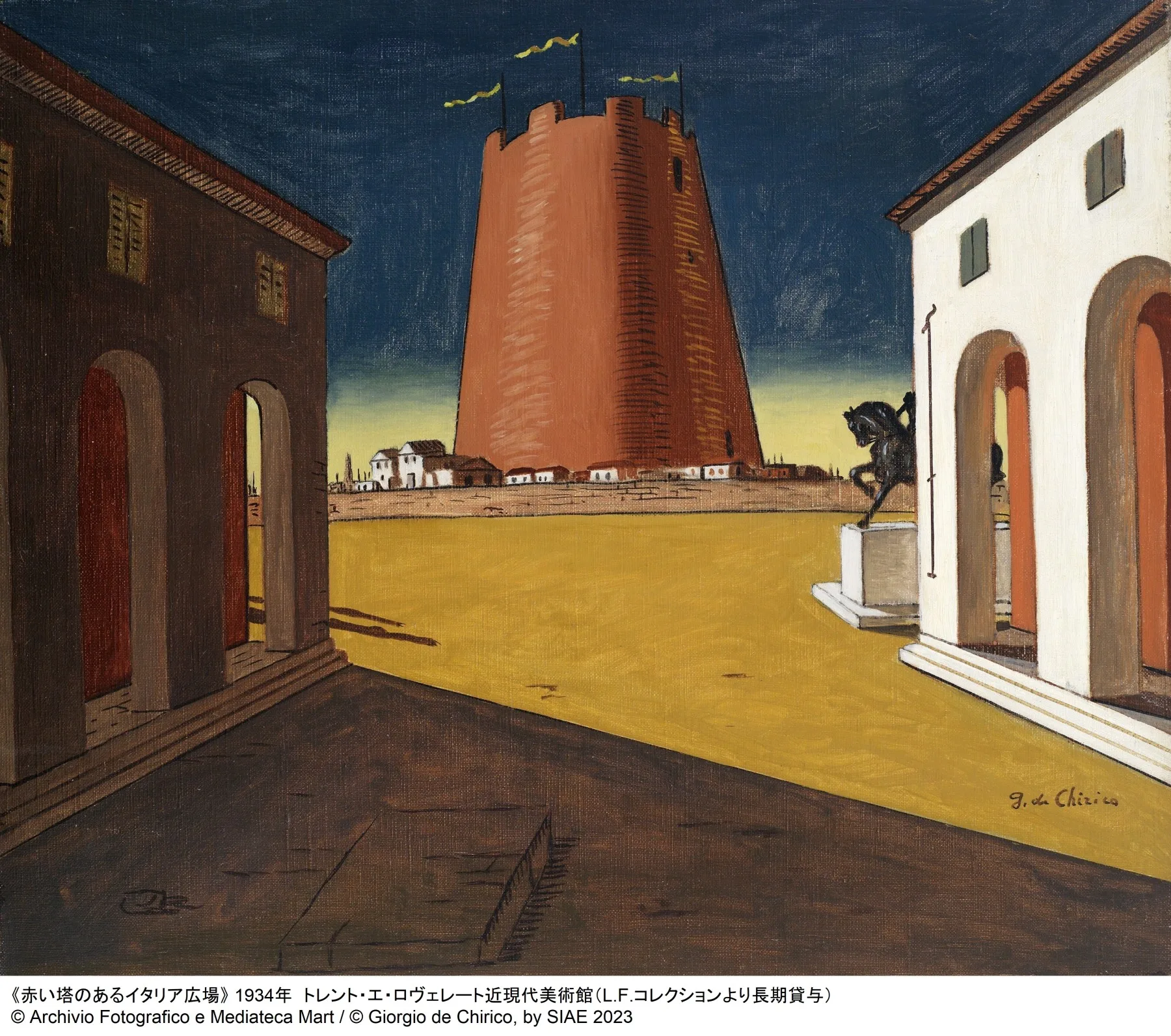 赤い塔のあるイタリア広場 1934 トレント・エ・ロヴェレート近現代美術館蔵(L.F.コレクションより長期貸与) © Archivio Fotografico e Mediateca Mart © Giorgio de Chirico, by SIAE 2023