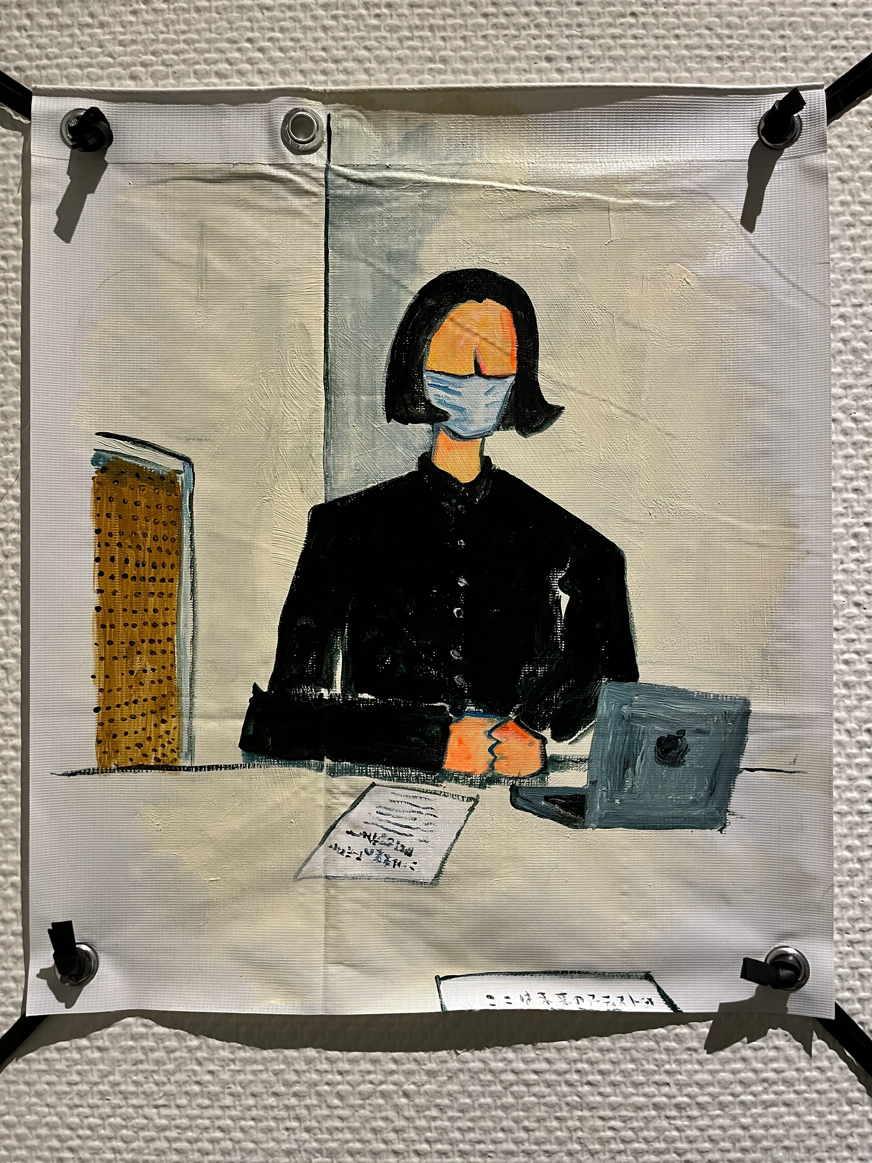 飯山はこのほかに、右側の壁面に設置された紙と鉛筆で鑑賞者に参加を促す作品も展示していた。鑑賞者に対して壁面に書かれた問いは、「あなたの心や体を支配するものやひとはなんですか? それをかいてください。言葉でも絵でもかまいません。」「あなたを支配するものやひとについて、なにか言いたいこと、伝えたいこと、怒りたいことがあったらそれをかいてください。言葉でも絵でもかまいません。」だった。こうした参加型の作品は飯山が継続的に取り組んでいるのものだと思うが、やはりよく見る手法であるというだけでなく、このパブリックな場で書ける範囲の内容を掲示し共有することに、実行的な「自身の物語をつくること」の力を見出すことはできなかった。また私が来訪したタイミングでは用紙のストックがなく、ここでも鑑賞体験のデザインの部分が気になってしまった。