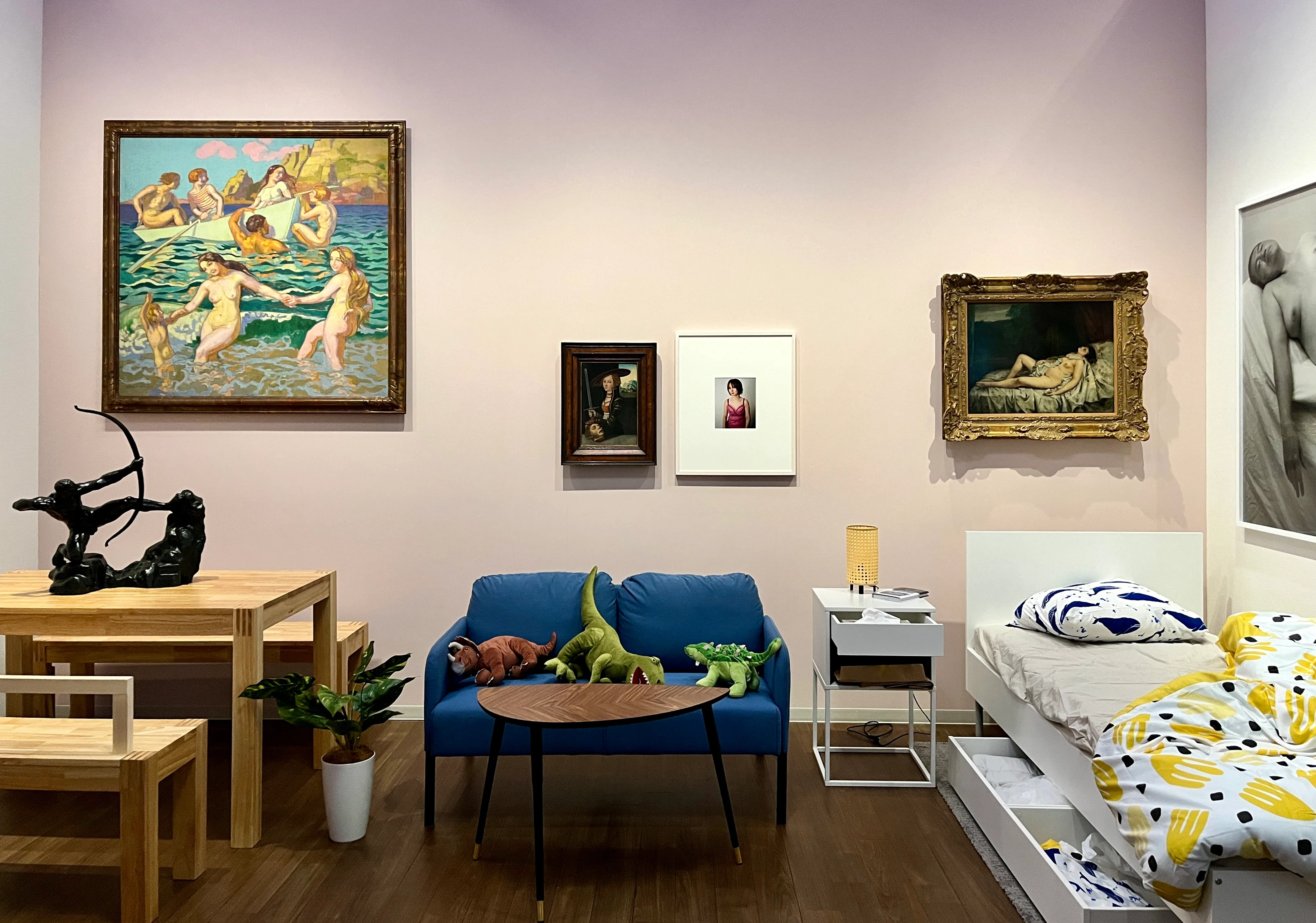 たとえば、鷹野隆大はIKEAの家具を配置した「部屋の中」に西洋美術館の所蔵品と自身の作品を併置していた。規格化された生活家具の中に非量産品の最たるものである美術品を並べるという脱構築性、また西洋美術館の所有する「権威的な」西洋絵画を生活空間という権威性とは正反対な場所に配置するという脱権威性が提示されたのはよくわかる。また、オールドマスターの西洋絵画に描かれている「まなざしを向けられるジェンダー像」を照射し、自作の対置によってそれを際立たせようとする意図も理解できる。しかし、そうした操作はいずれもシンプルかつ既視感のある試みであり、重層的な読解を喚起されることはできなかった。