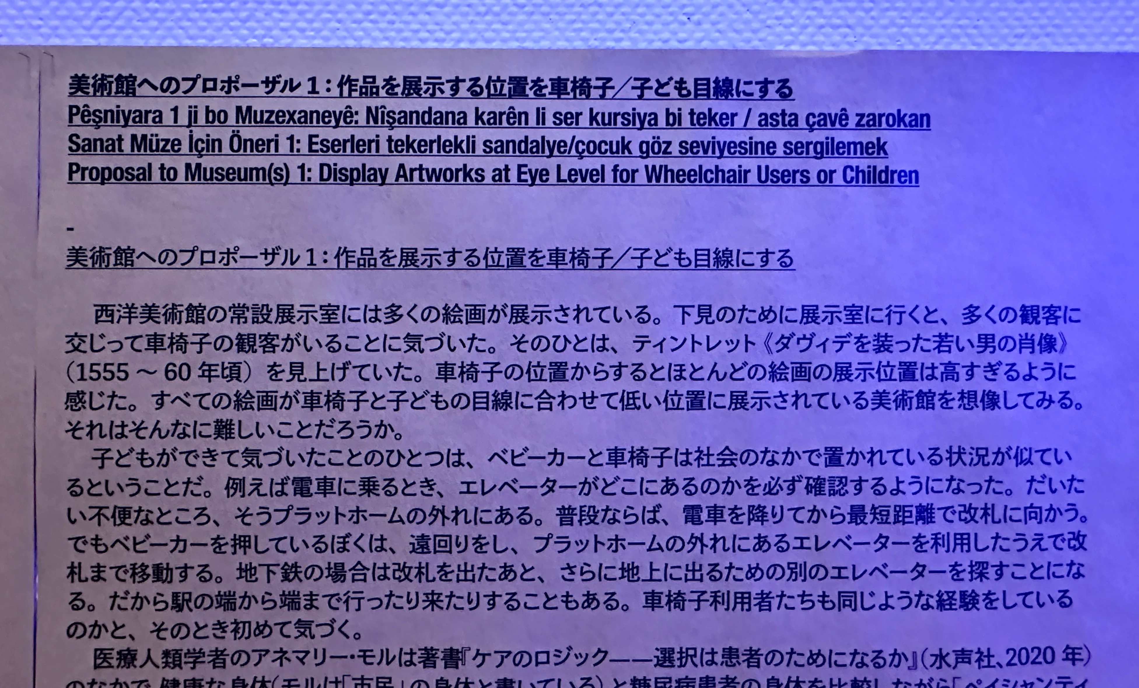 田中の提言は美術館の公共性を問うものであり、その公共性とは山本が指摘するように「『みんな』から排除されがちな社会的な弱者にしっかりと目を向けること」(*4)だ。田中は自身の子供が産まれて以降、子供に向けた美術についても考えるようになったと話していたように思う(*5)。本展での田中の取り組みで子供に関する言及が多いのは田中の育児の実体験に基づいていることが伺えつつも、同時に日本社会の構成員のひとりとして美術館の「公共性」に誠実に向き合おうとしていることがわかる。「美術館へのプロポーザル5:公共施設での翻訳言語の選択を拡張する」において田中は翻訳言語に英語、韓国語、中国語だけでなく、トルコ語、クルド語を加えることを求めた。昨今、クルド人移民に対して、日本では急速に排外主義の新たな矛先が向けられるようになりつつある。そのようないままさに眼前で起きている公共からの排除、あるいは「我々に合わせろ」という同化の要求に対して、まずは彼らの言語を「公共」に内包しようとするための田中のアクションであると受け取った。また「美術館へのプロポーザル1:作品を展示する位置を車椅子/子ども目線にする」は、本展の中の田中の割り当てられた展示スペースのみならず、西洋美術館のコレクション展においてもいくつかの作品において実施されていた。これまでマイノリティ側にのみ課せられていた「不便を受け入れる」ことを転換していくための取り組みの第一歩だっただろう。