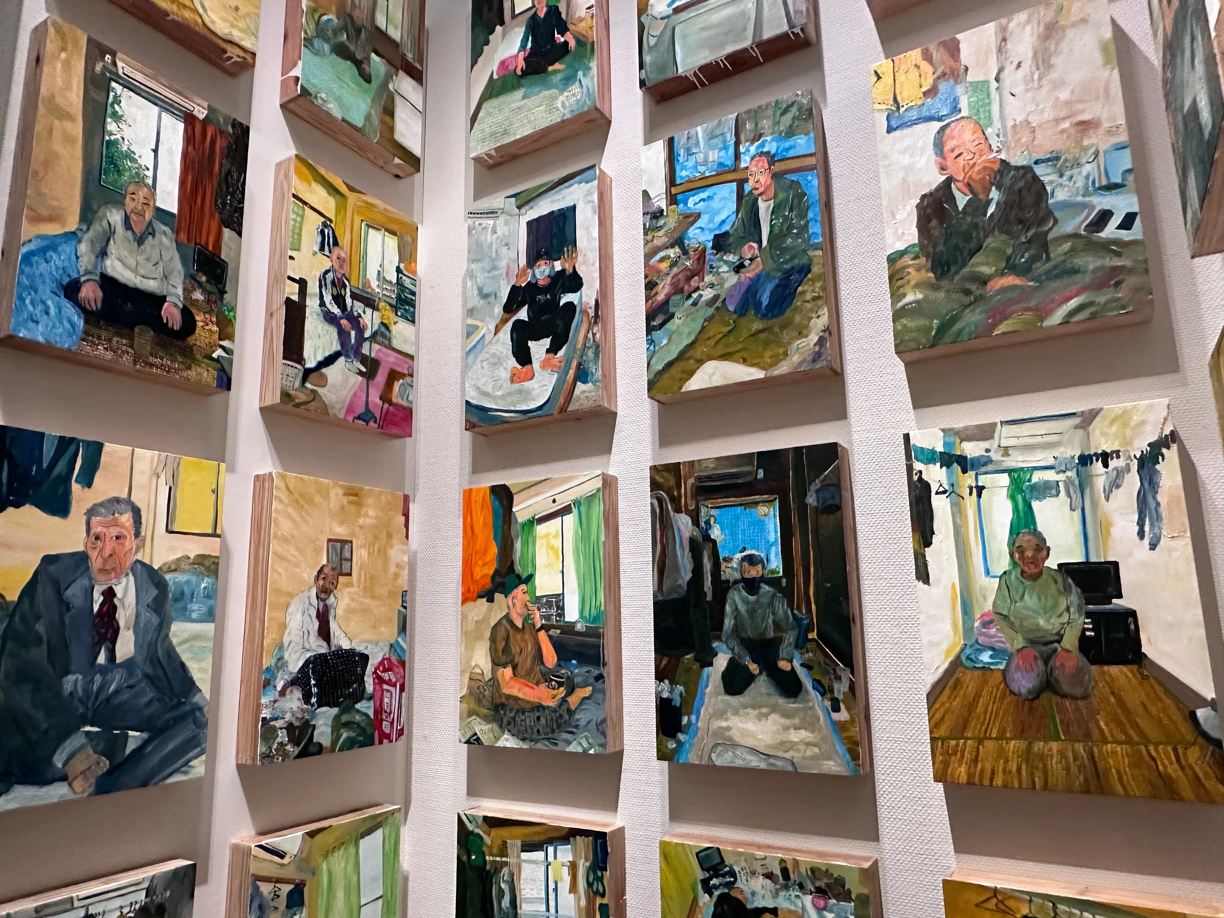 弓指寛治の作品はかつて上野公園に多くいたホームレスの人たちの現況や人生をリサーチしていくものだ。そのきっかけは本展を企画したキュレーターの新藤淳からの打診で、弓指が会場に掲示したテキストによれば、新藤は上野公園内にある西洋美術館に長年いるにもかかわらず、ホームレスの人たちを見て見ぬふりをしてきた自覚があるという。