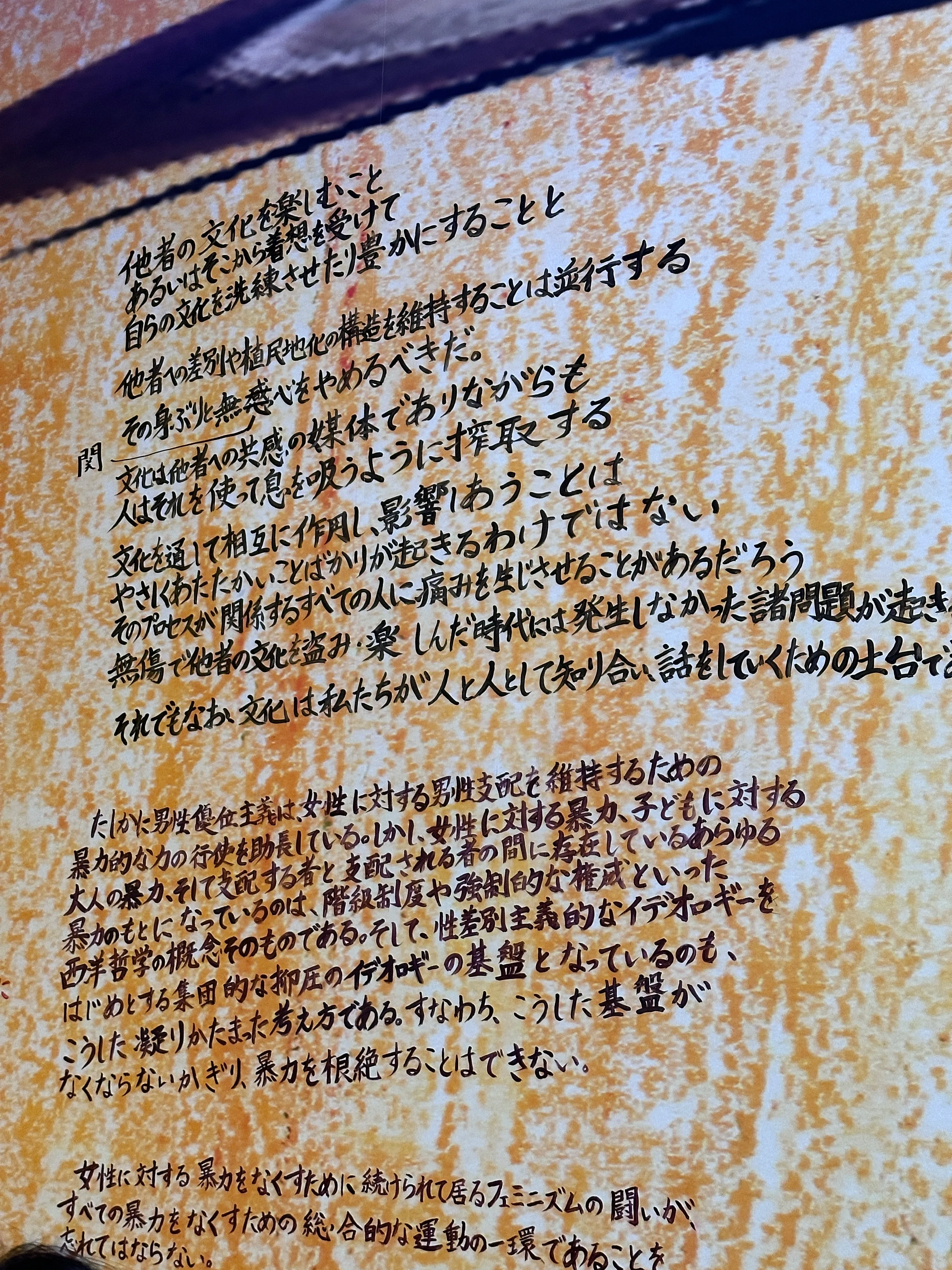 まず、このテキストが非常に読みづらい。手書きのテキストはそれ自体が読みやすさを減じてしまうが、加えて文字が小さく、高さのある壁面を見上げたときに上の方の文字の視認が難しく、配置されている絵画作品の額縁が邪魔になり物理的に視界が遮られてしまうことも起きていた。日本人男性の平均身長ほどの背丈がある私でもそのような見づらさが感じられたので、背の低い鑑賞者や、それこそ車椅子ユーザーの鑑賞者にとってはさらに見づらい作品だっただろう。また日本語の手書き文字は日本語を母語としない鑑賞者に対して高いハードルを課してしまうのではないだろうか。あるいは、壁面のテキストにあるようにこれは「作り手が私自身の物語をつくること」の試みだったかもしれないが、他者に伝わるものとならなければ、その物語は力を持たないか、自身とその協力者のなかで強い力を持つのみで完結する物語となってしまう。