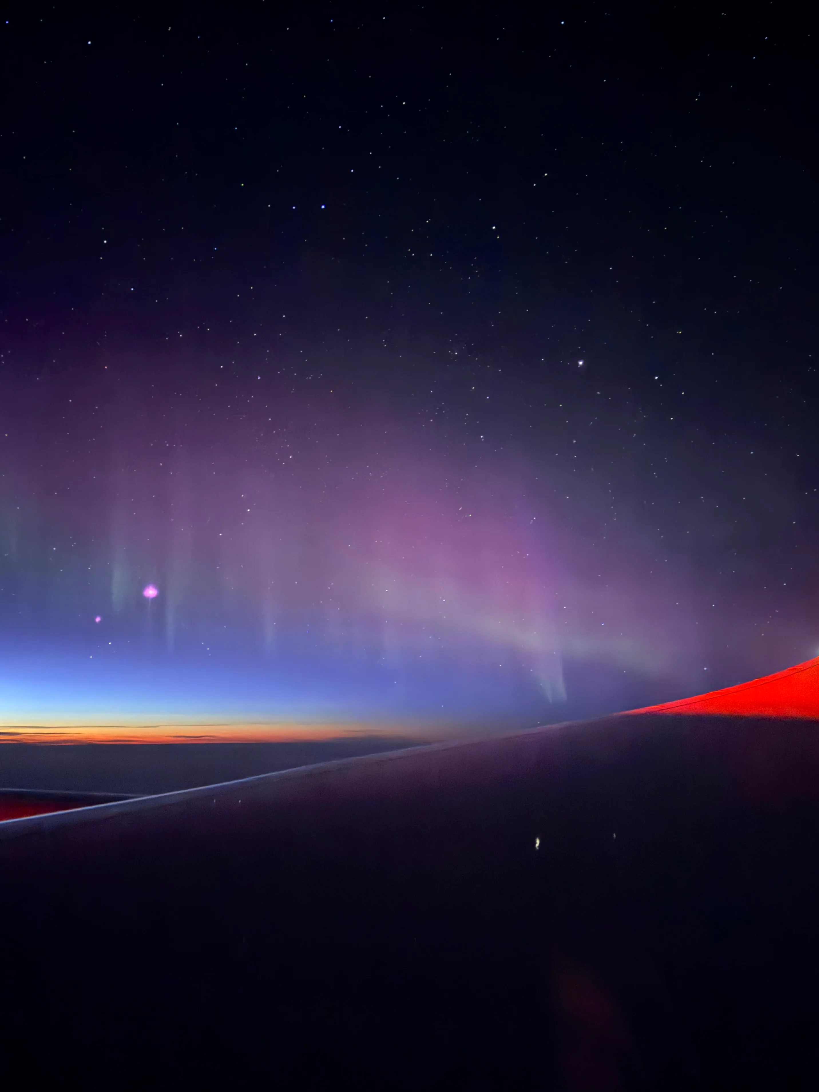 とはいえ、ヨーロッパへ向かう楽しみがひとつだけあります。それは、機上からオーロラに出会えるかもしれないこと。ロシア上空を飛べなくなった現在、北極圏を迂回するルートが主流になりました。今回はグリーンランド付近でオーロラに遭遇。肉眼ではうっすらとしか見えませんでしたが、長時間露光で撮ってみると、淡い緑の光がゆらめくように写っていました。満天の星のなかを飛ぶ深夜のフライトも、また格別です。
