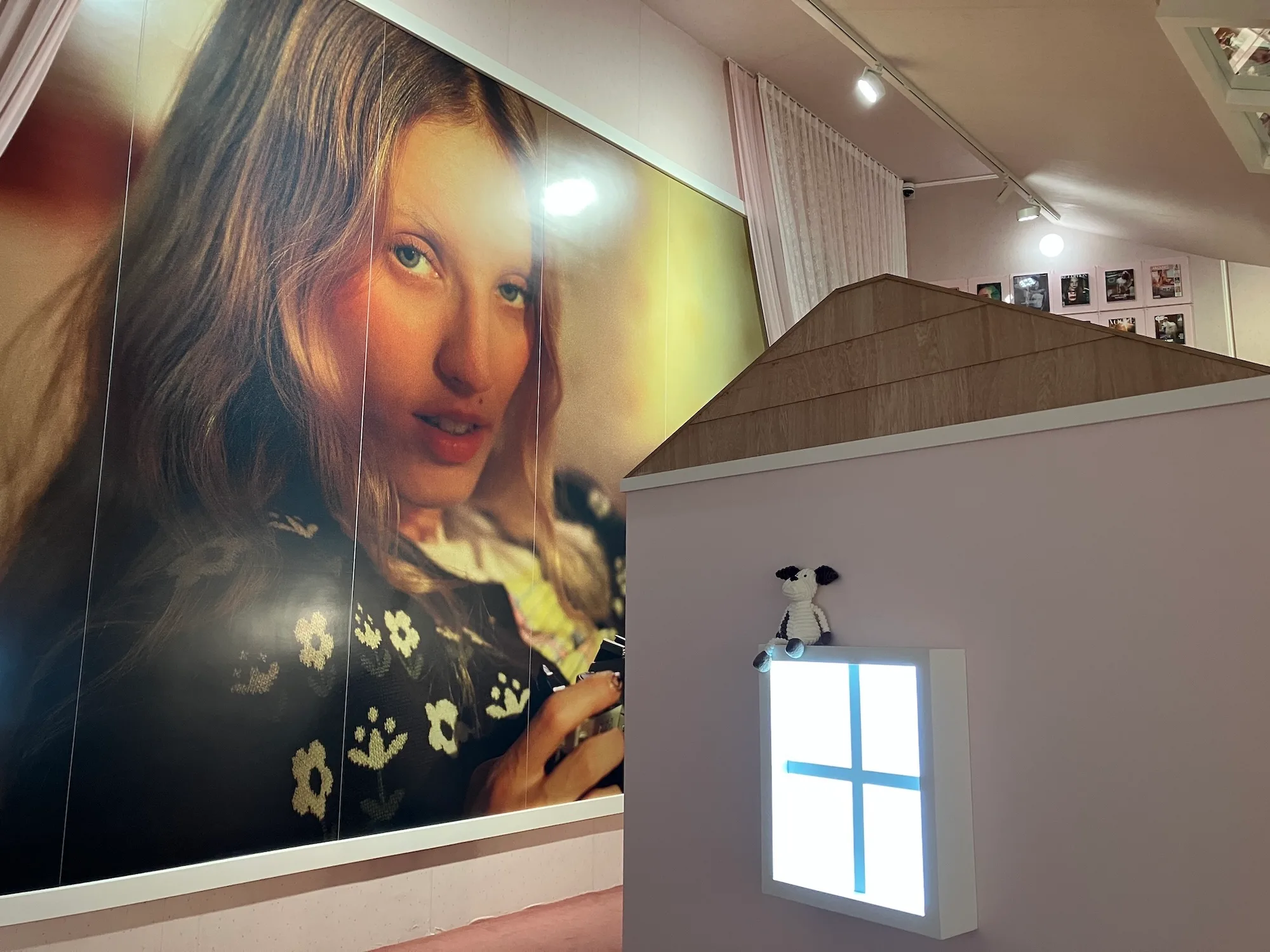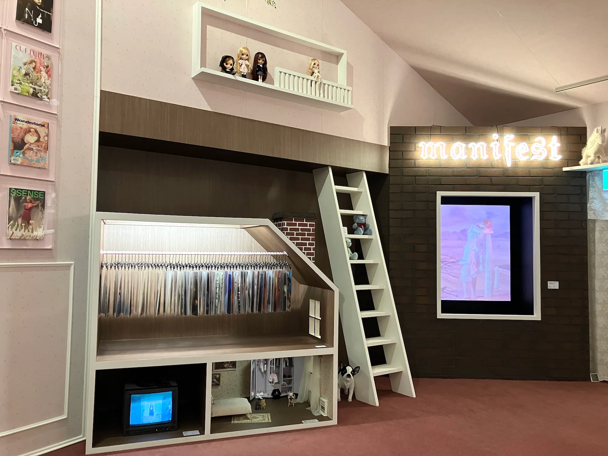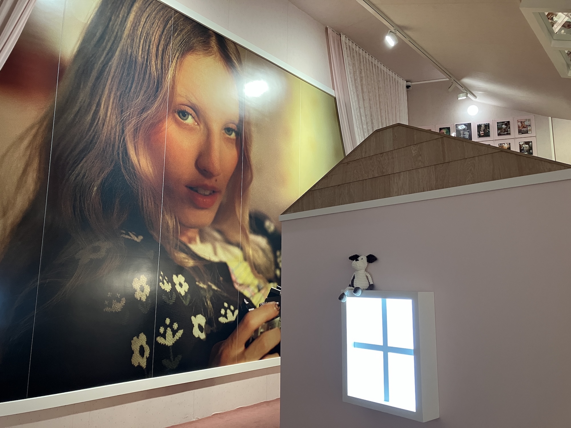 そして最終章「New Nostalgia」では、フロア全体に大小様々な家や部屋のようなインスタレーションが展開されます。広告やMV、雑誌など、領域を横断して活動してきたコリンズのヴィジュアル感性を、空間として体験できる構成です。構造物の内部には、作家自身10代の頃の写真やベッドルームのセット、インスピレーション源などが断片的に配置され、まるで彼女の頭の中に入り込んだかのような感覚を覚えました。