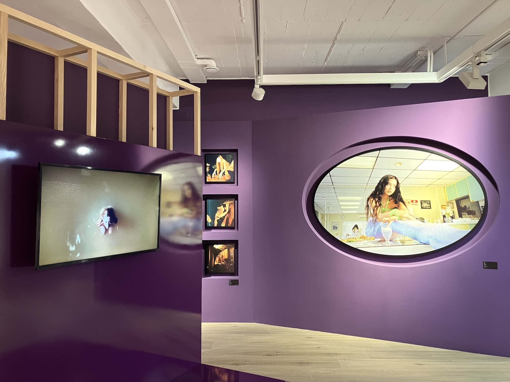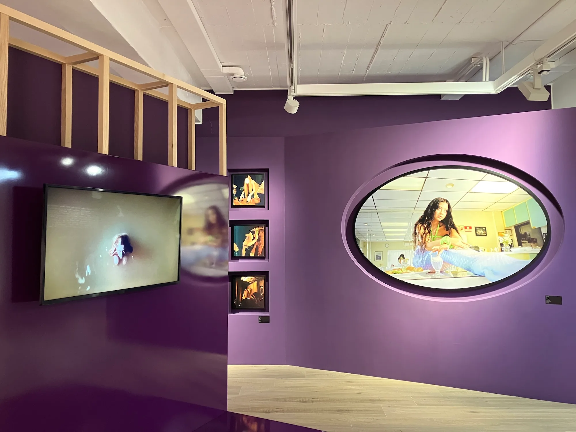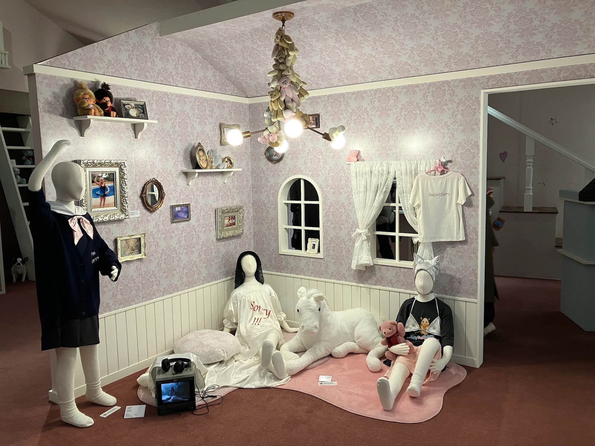 そして最終章「New Nostalgia」では、フロア全体に大小様々な家や部屋のようなインスタレーションが展開されます。広告やMV、雑誌など、領域を横断して活動してきたコリンズのヴィジュアル感性を、空間として体験できる構成です。構造物の内部には、作家自身10代の頃の写真やベッドルームのセット、インスピレーション源などが断片的に配置され、まるで彼女の頭の中に入り込んだかのような感覚を覚えました。