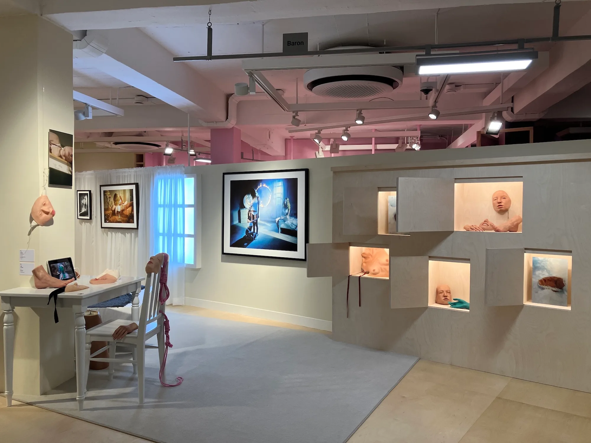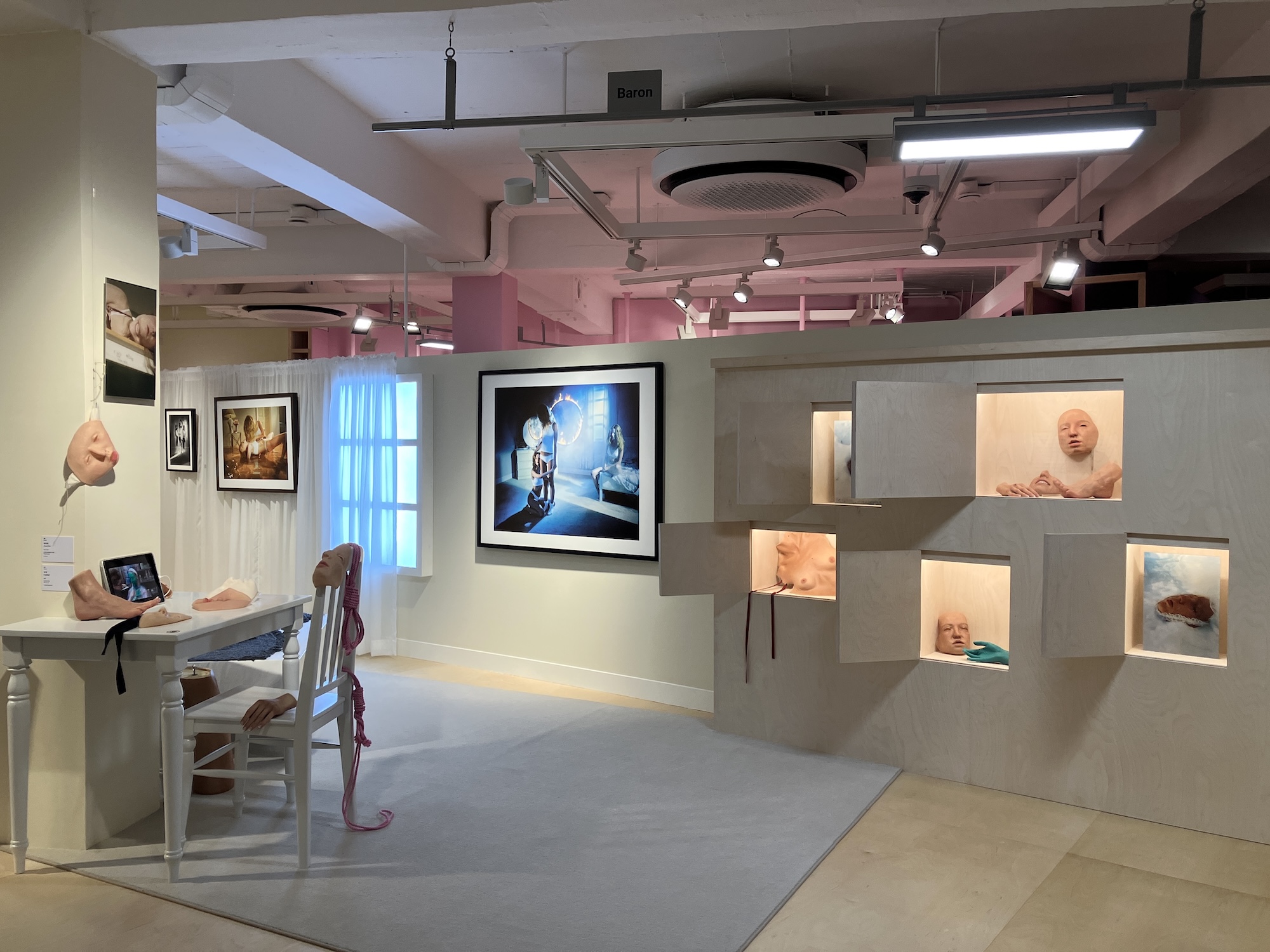 なかでも印象に残ったのは、家の窓のような構造にライトボックスで写真を浮かび上がらせたり、ネオンサインとともに大判写真を並べたりと、世界観を重視したセノグラフィーでした。とりわけ最終章では、ドールハウスの中に人形と小さな写真を配置した展示や、壁一面に並ぶポラロイド、セレクトショップのラックのようにハンガーに吊るされた写真群など、作品そのものを見せるというよりも、作家の美学を空間全体で伝えようとする姿勢が際立っていたように思います。さらに驚くべきことに、本展は入場無料。写真撮影もOKです。
