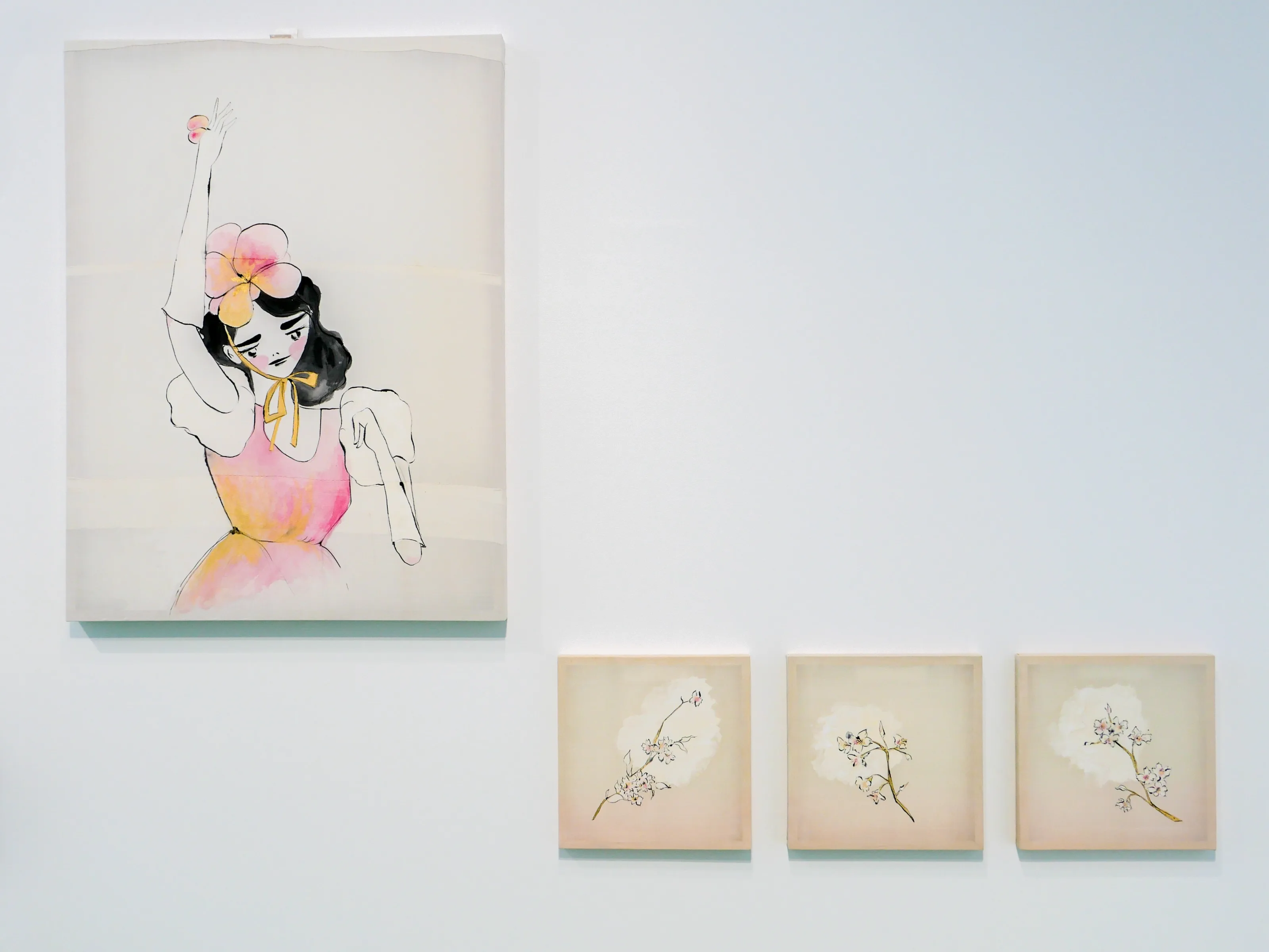 桜の絵画3点は、私が去年見た桜と1945年に撮影された写真を元に振袖の裏地に描きました。戦前海外公演でドイツやイタリアを訪れた宝塚歌劇団の団員たちが桜柄の着物を着ていたように、桜は様々な象徴性やイメージが付与されてきました。でも毎春咲く姿はただ美しく、私たちに様々に感じ、考えさせてくれます。