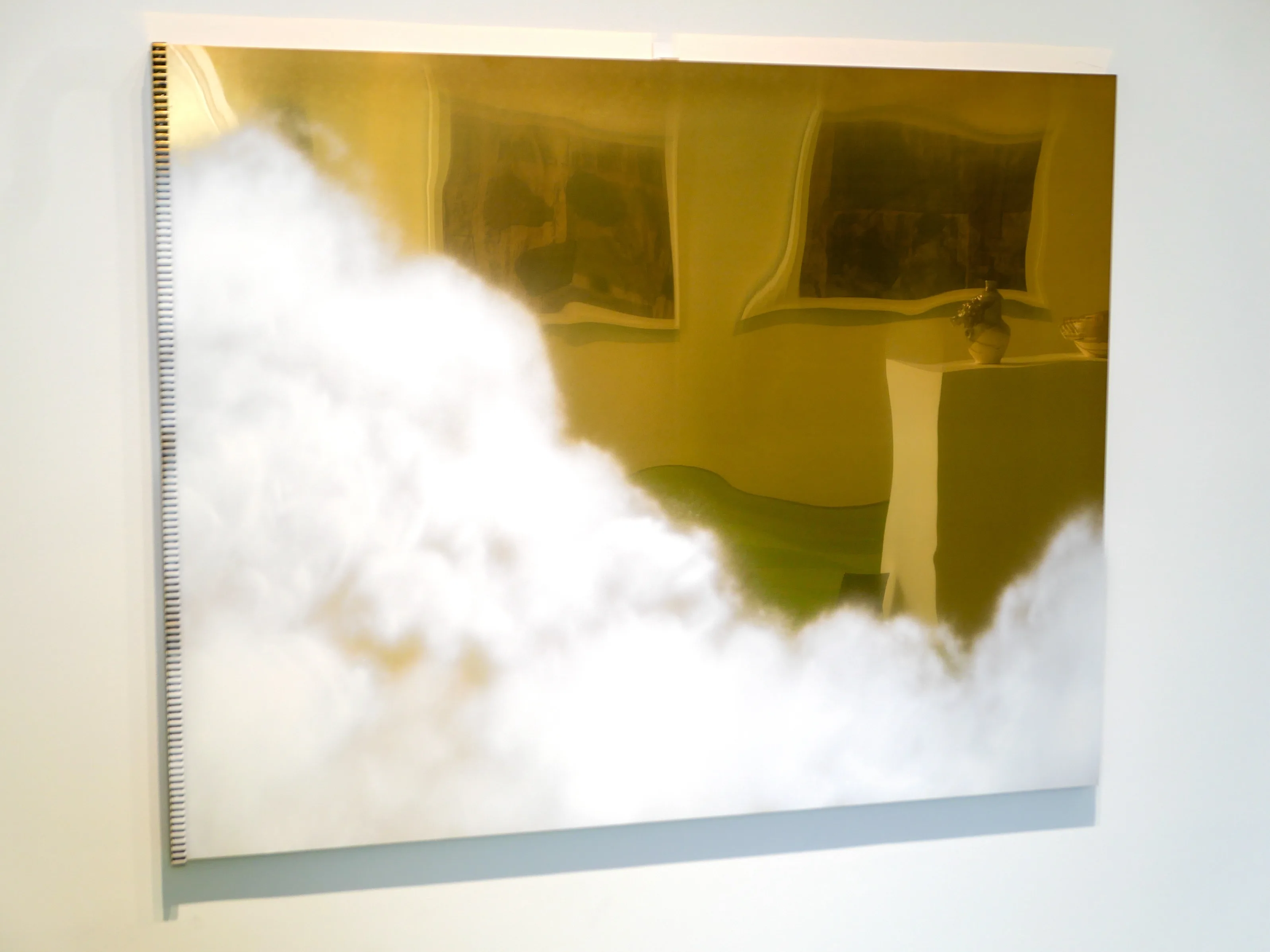 木村:小林さんの活動は多彩なので、そのエッセンスが伝わる作品を紹介したいと思いました。私が最初パリで拝見した《SKY》は、真鍮板に白い雲がスプレーで描かれて一見綺麗ですが、よく見ると表面に銃弾の薬きょうが並んで、暴力的な印象も受けます。雲は普遍的な存在ですけれども、この作品を見ると、戦闘機に乗る兵士が見た雲、風船爆弾の近くを通った雲、地面に落ちた薬きょうを拾う子供たちが見上げた空など色々な連想が浮かんできます。いっぽう《春のをどり》は、支持体に小林さんのおばあさまの着物の裏地が使われ、その繊細で柔らかいイメージは《SKY》の真鍮素材の強さと対比的です。小林さんの作品は、テキストや小説を含めて歴史の大きな出来事に巻き込まれた無名の女性や子供たちに目を向けるのが特徴のひとつですが、それを感じていただける展示ではないかと思います。