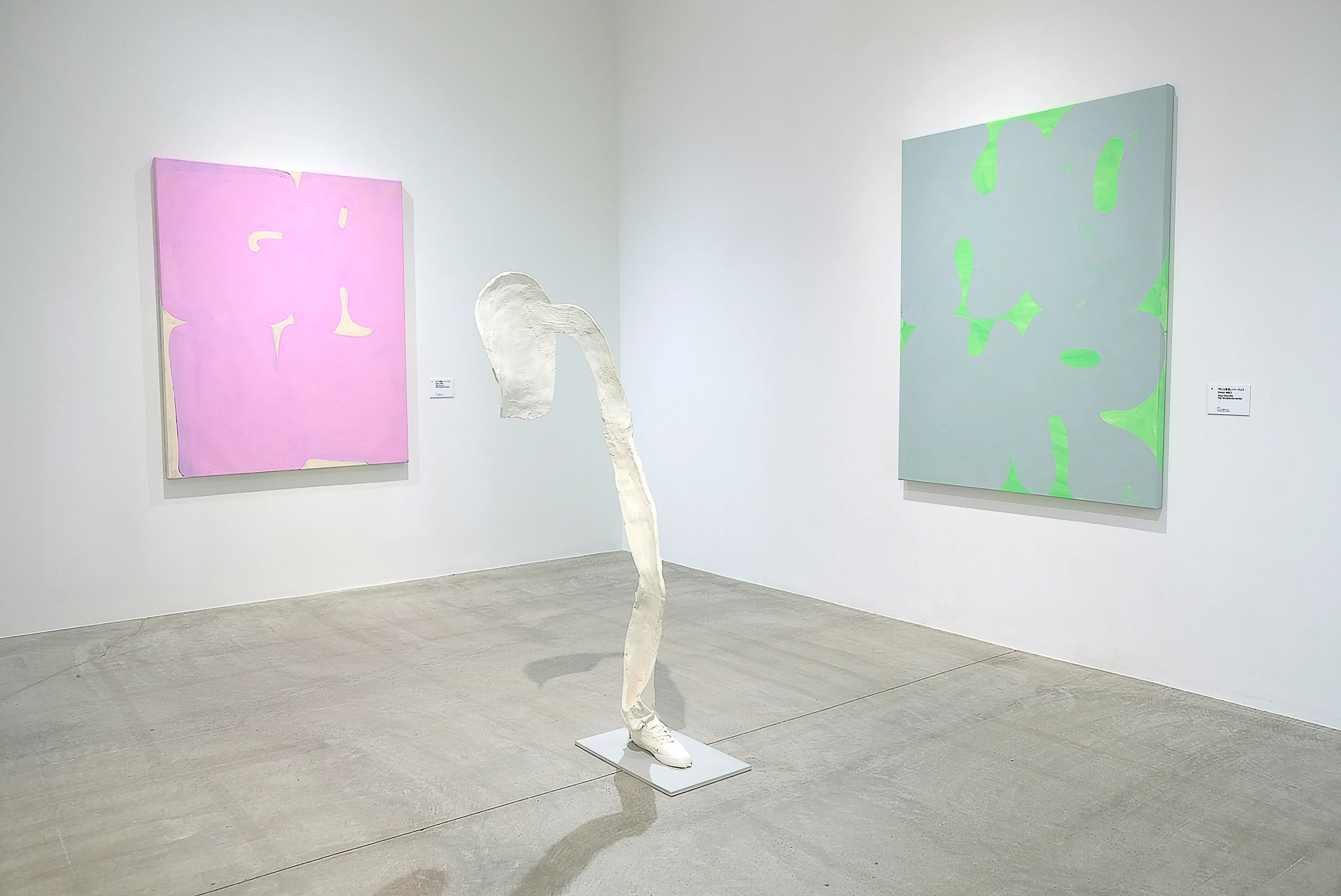 そして、最後の展示室には、「皮膚シリーズ」《立っている花 2》と「平らな彫刻シリーズ」が並ぶ。「平らな彫刻」シリーズは、絵画のように見えるが、ヴルムはこれらも彫刻として制作している。キャンバスの上に「Gain」や「Hour」などの「3次元的な単語の塊を押しつぶした形で表現した」(ヴルム)。そして靴を履いた人間の身体の一部を描写した《立っている花 2》は、あえて体の一部分のみを表現することで、存在していない体の全体を見るものに想像させようとしている。