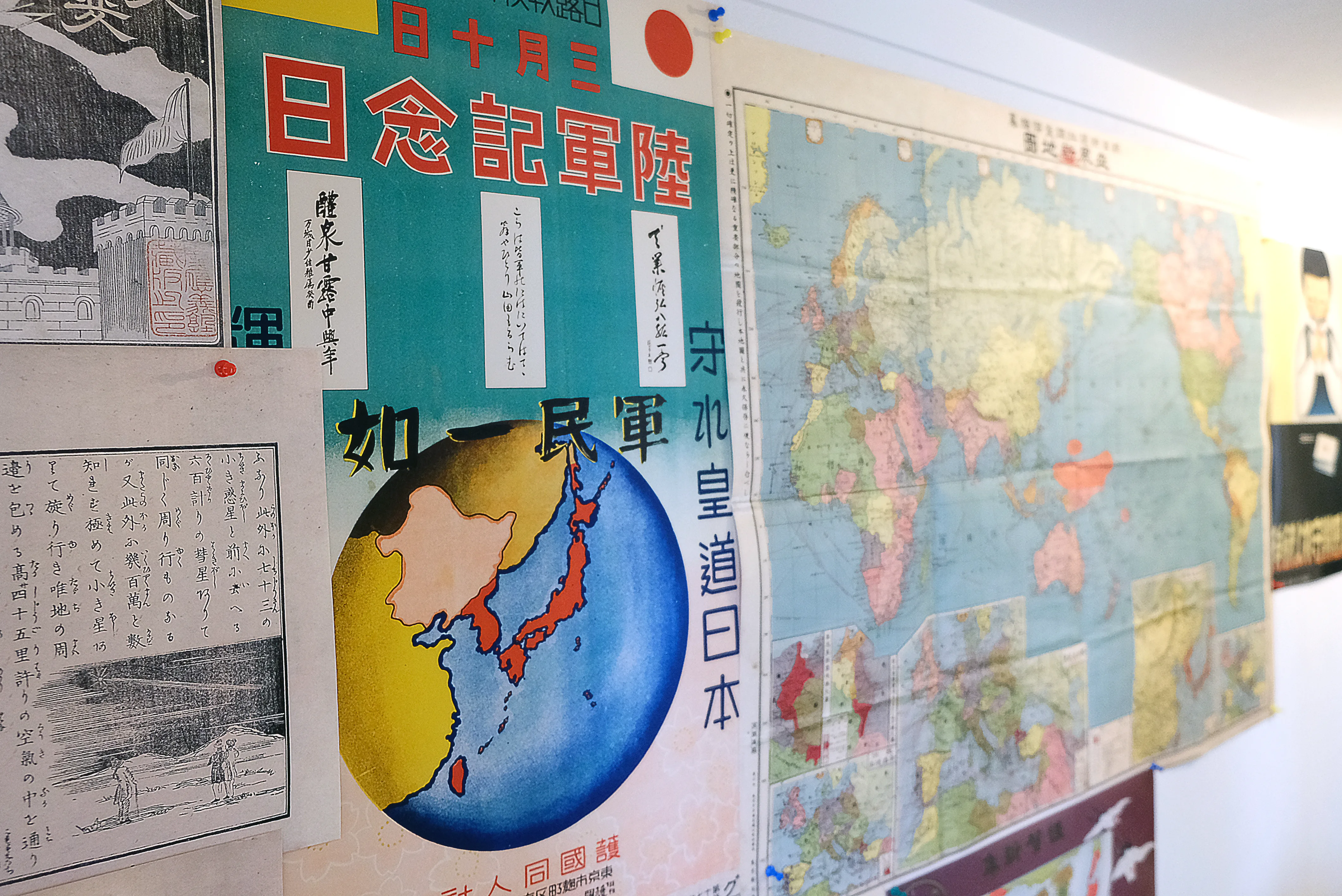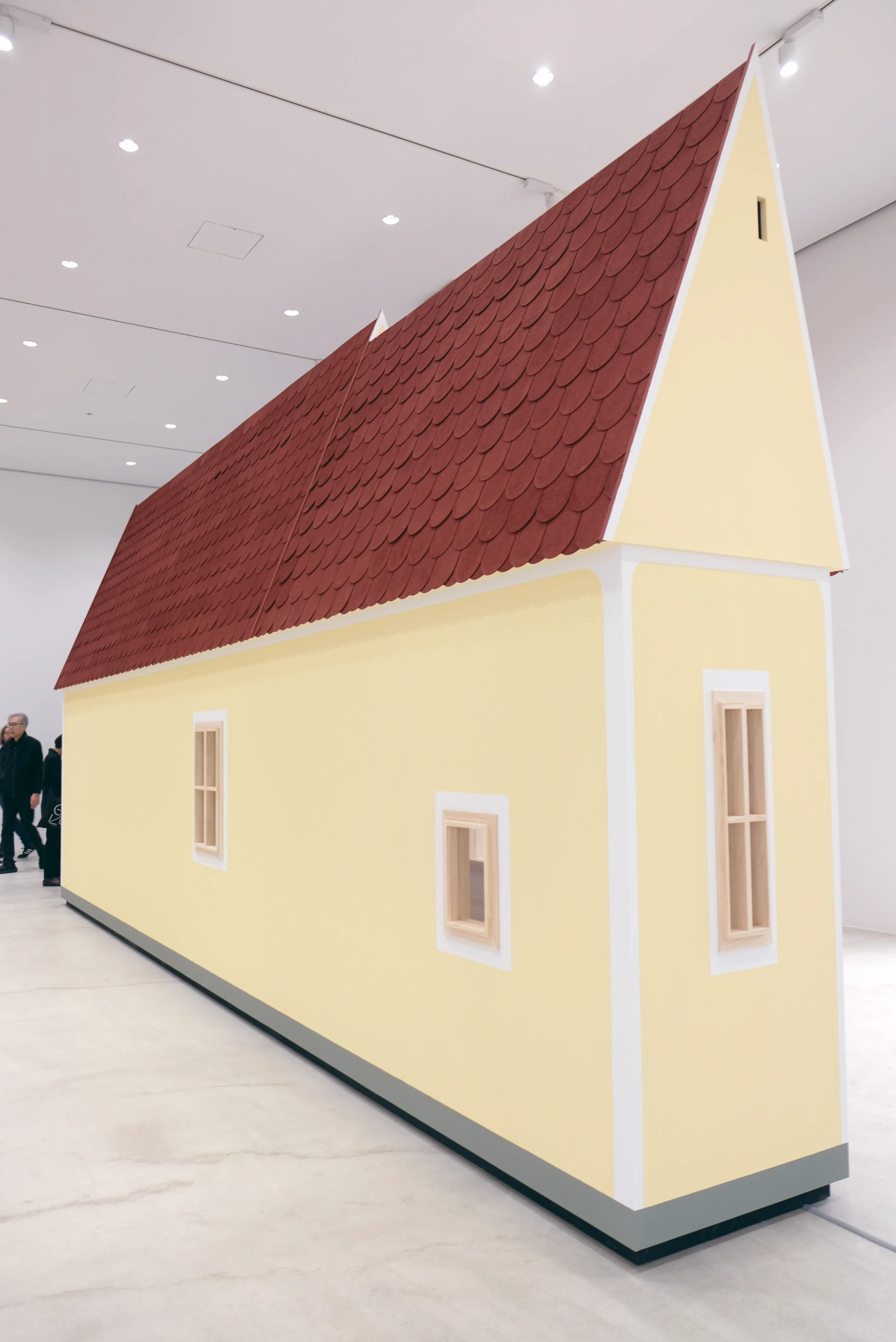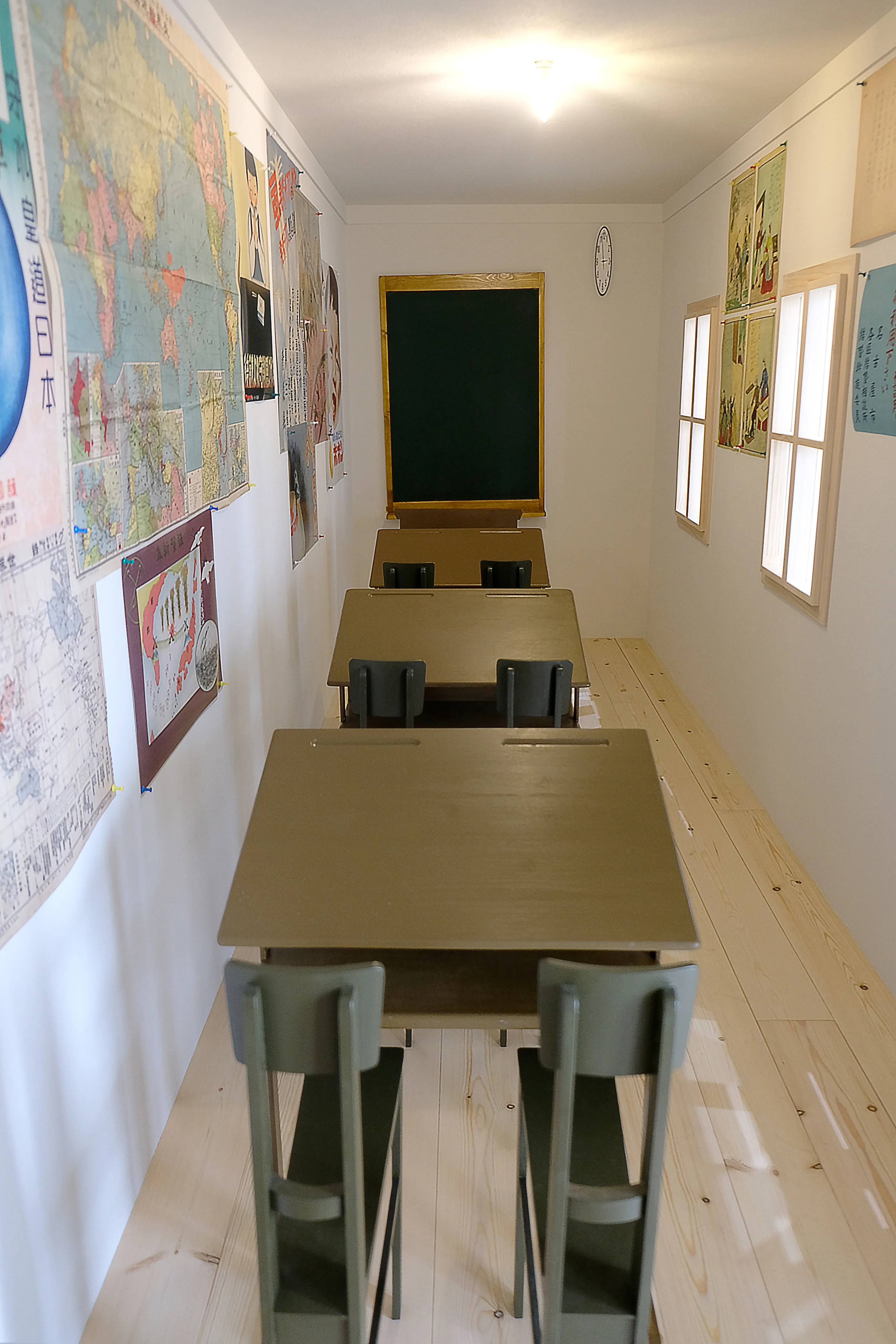 展示される作品は19点。冒頭に展示されるのは最新作の《学校》。極端なほどに幅が狭められた黄色い壁の建物は、オーストリアの典型的な学校建築。この建物の中には、教室や机、椅子などが設えられているが、こちらも極度に幅が狭められている。「建物の幅を狭めたのは学校が持つ抑圧的な権力などをイメージしている」(ヴルム)そうで、教室の壁には、国威発揚に関するポスターなど明治時代以降の教材や印刷物が張られている。「時代ごとに変わっていく『正しさ』がいかにあいまいであるかがこの作品のテーマ」(ヴルム)。
