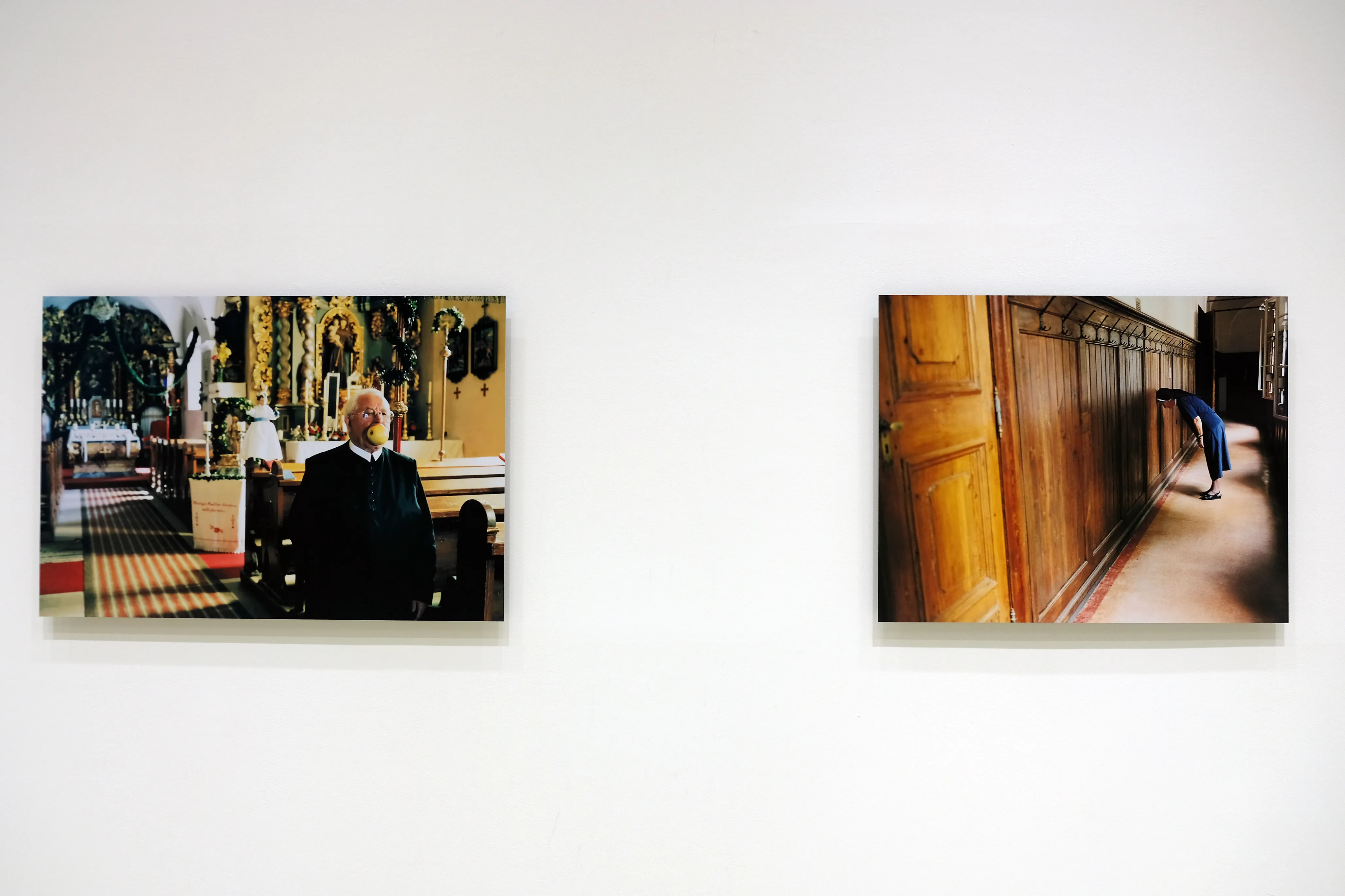 《学校》と同じ展示室にある写真の作品もまた、ヴルムにとっては彫刻作品だ。様々な参加者に不自然なポーズを取らせ、写真に収めることで「写真の彫刻」を作り上げている。修道士と修道女や、そしてヴルム自らによる、時にはユーモラスにも感じる佇まいは、モデルが内包している神聖さ、権威などにあらためて向き合い、問い直す作用をもたらしている。