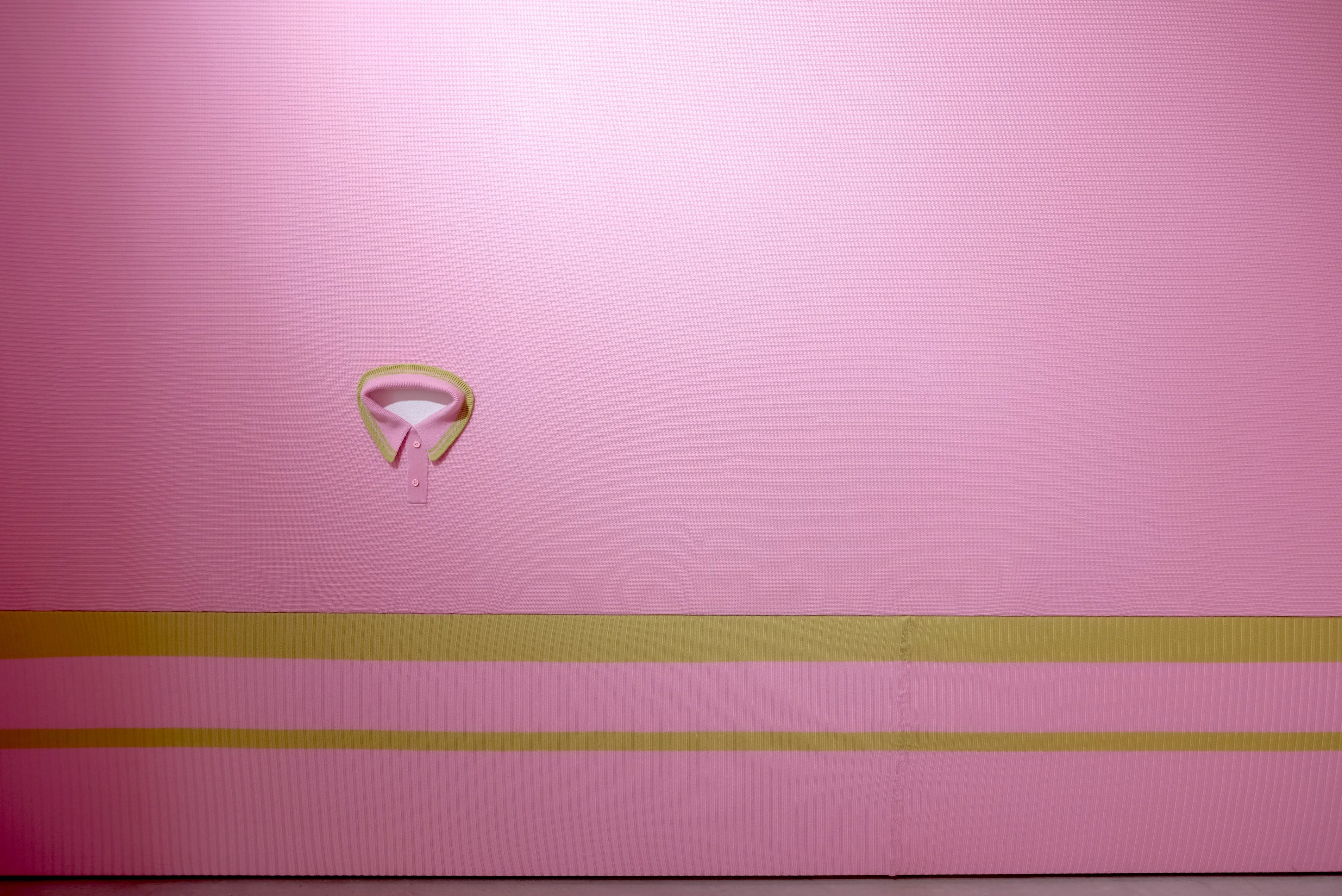 様々な素材を用いて彫刻作品を制作するヴルムは、衣服を使った作品も数多く制作している。《精神》は、一見するとピンクに彩色された一室であるだけに見えるが、よく見ると壁や天井に襟や袖があるのがわかる。部屋がセーターを着込み、そのなかに鑑賞者が包まれているのだ。