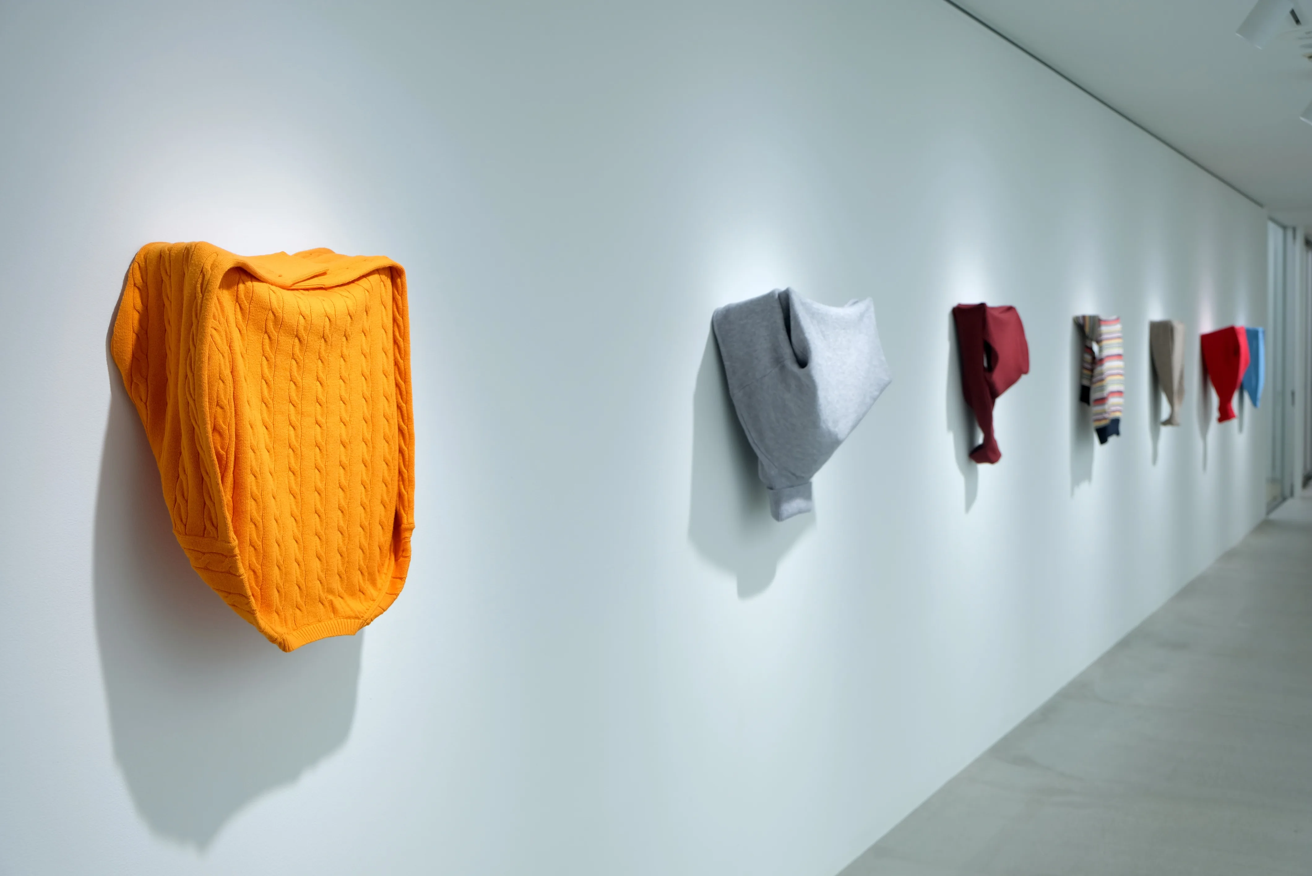 また、《吊されたセーター》は既製品のセーターを固定し、彫刻作品として展示した作品。普段は気にもとめなかったセーターの色や網目模様、形の面白さがあることにも気がつく。 「みなさんも家で実現できる作品です。わずかな時間で作品が生まれますが、またわずかな時間でその作品がすぐに消えてしまいます」(ヴルム)