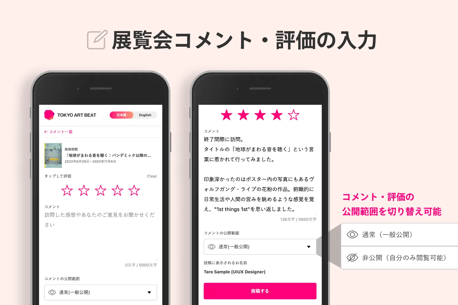 ・コメントは5000字まで入力可能!一言感想から長文レビューまで、あなたの言葉で全世界におすすめ展覧会の魅力を発信しよう。