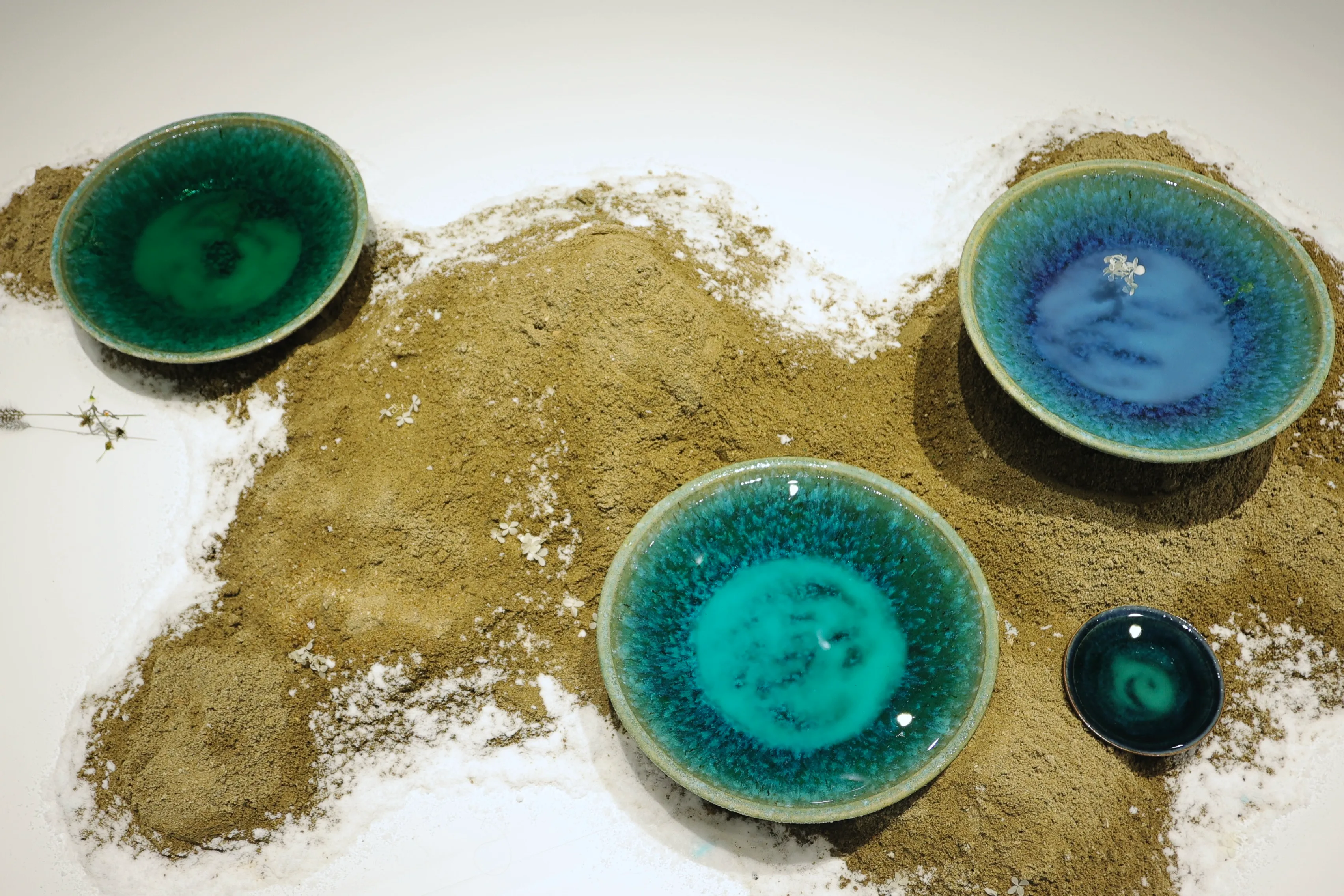 水を用いた作品《Ripple》は一見すると動きがなく見えるが、ほか作家の作品に影響されて水面が動く、塩が結晶化するなどのわずかな変化が発生している。「一度も同じ瞬間はないということ、そして瞬間瞬間は取るに足らないものもすべては呼吸していて循環の中にある。ひとところにとどまるものはひとつもないことを可視化したかった」と話す。
