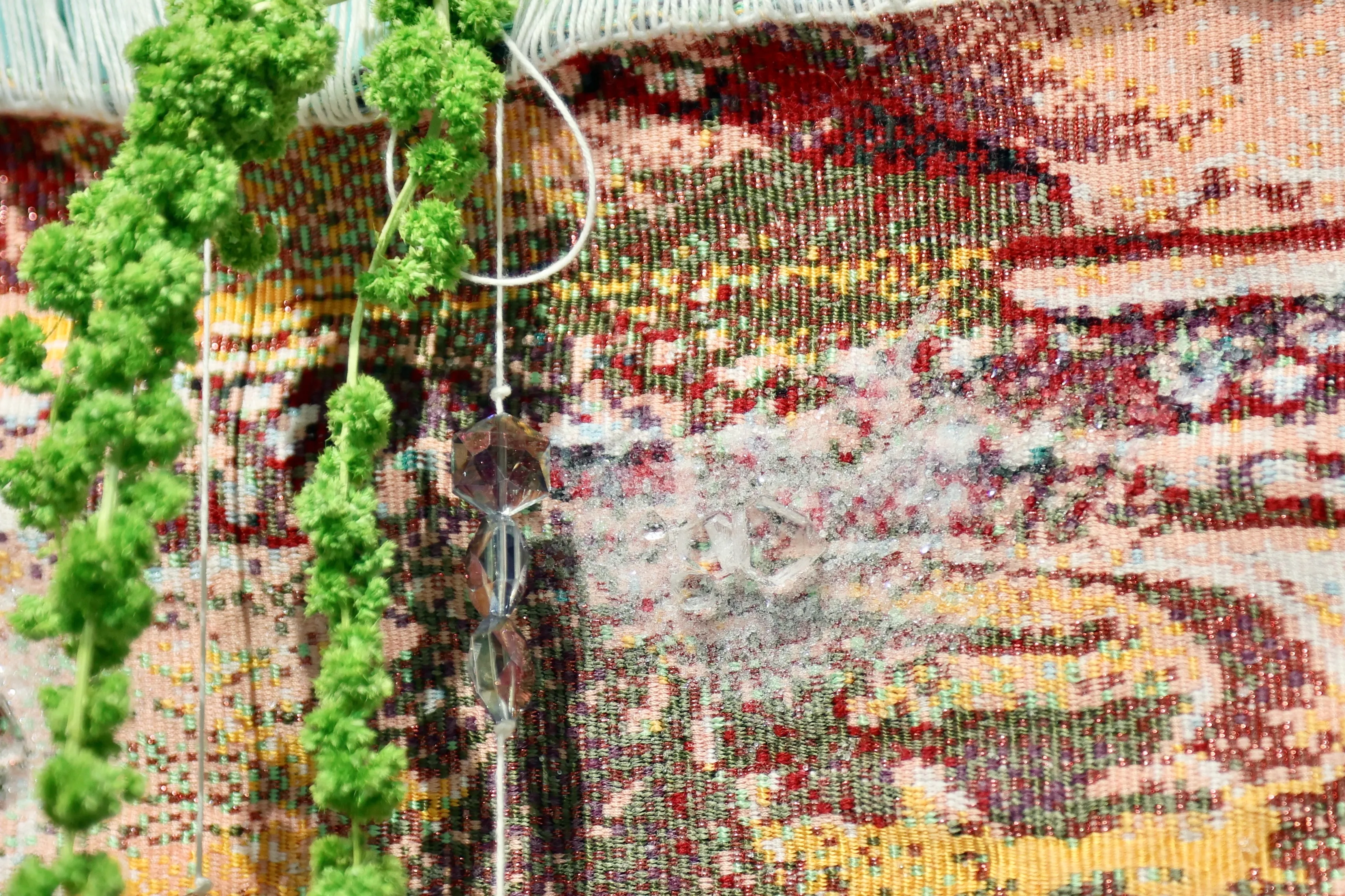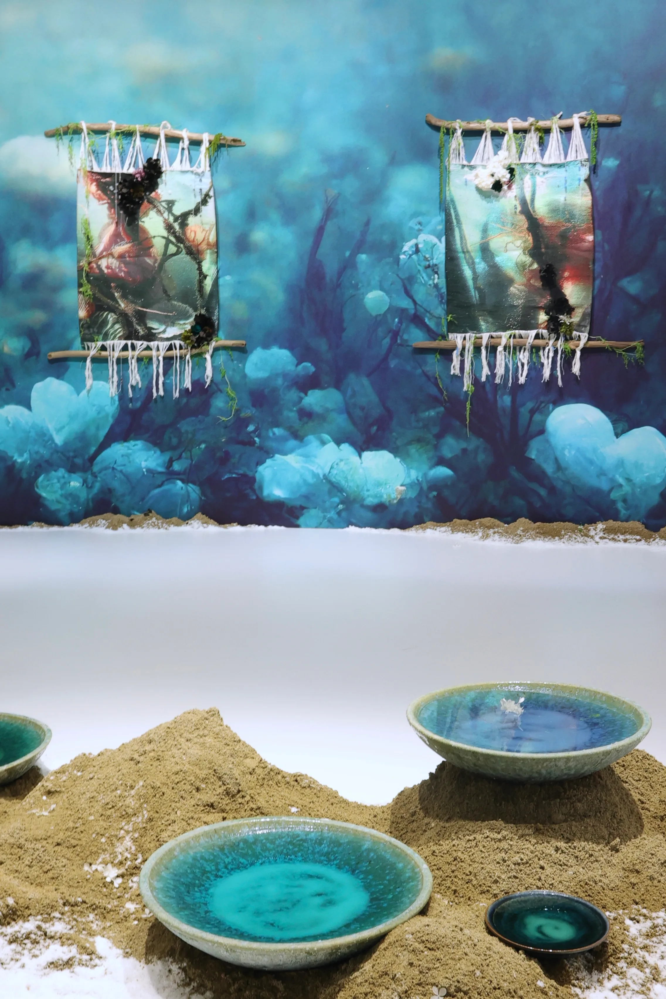本展の会場に足を踏み入れると、懐かしく良い香りが漂ってくる。これは、ビアンカ・ボンディの作品の一部から発せられる香りだ。ボンディは1986年ヨハネスブルグ(南アフリカ)生まれ、パリ在住。おもに塩水を使った化学反応、植物などの有機物や鉱物を用いた作品を手がけ、今回はタペストリーや塩、水などからなる作品を出品している。香りはタペストリーの作品「Ebb(引き潮)シリーズ」から発せられるもので、「神話的で先祖に還るような古い匂い」をイメージして友人に調香してもらったという。