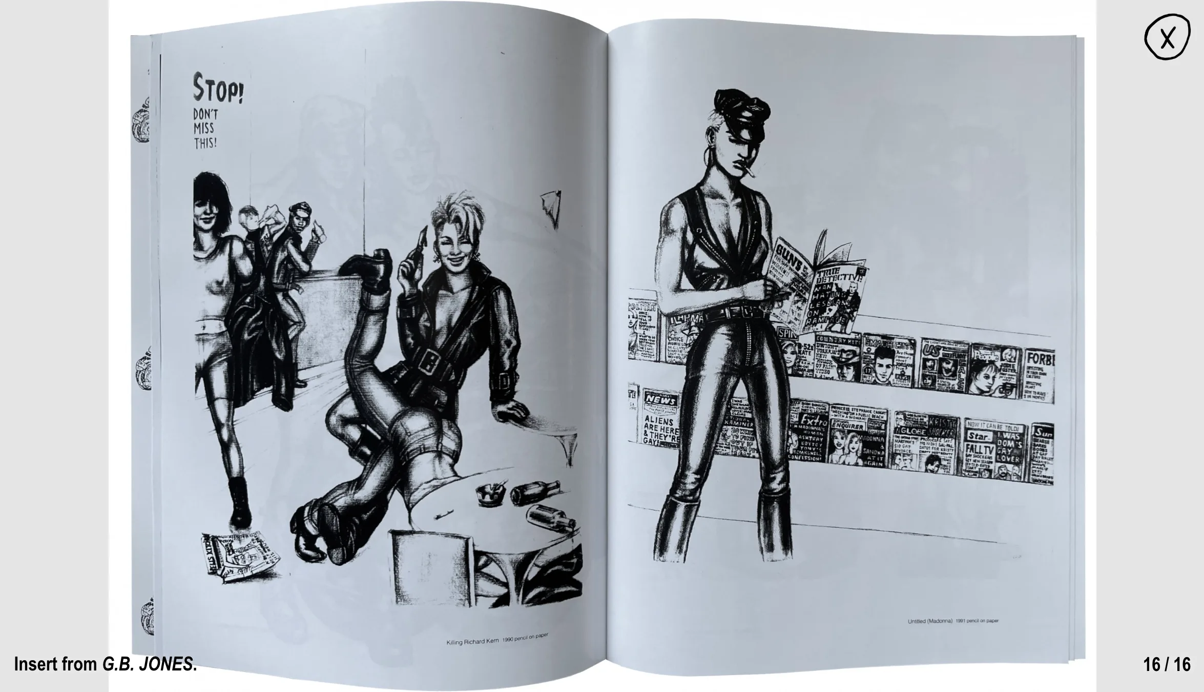 いっぽうでブッチのアイデンティティを追求していたのがG.B.ジョーンズ(1965〜)だ。彼女は80年代後半のクィア・コアと呼ばれるパンクにおけるクィアムーブメントのなかで活躍した作家で、J.D.sというZineに多数のレズビアンを描いた作品を寄稿していた。ジョーンズによってモノクロの絵のなかに表されたレズビアンたちは、警官であったりバイカーであったり、極めて誇張されたマニッシュな姿で描かれることが多い。