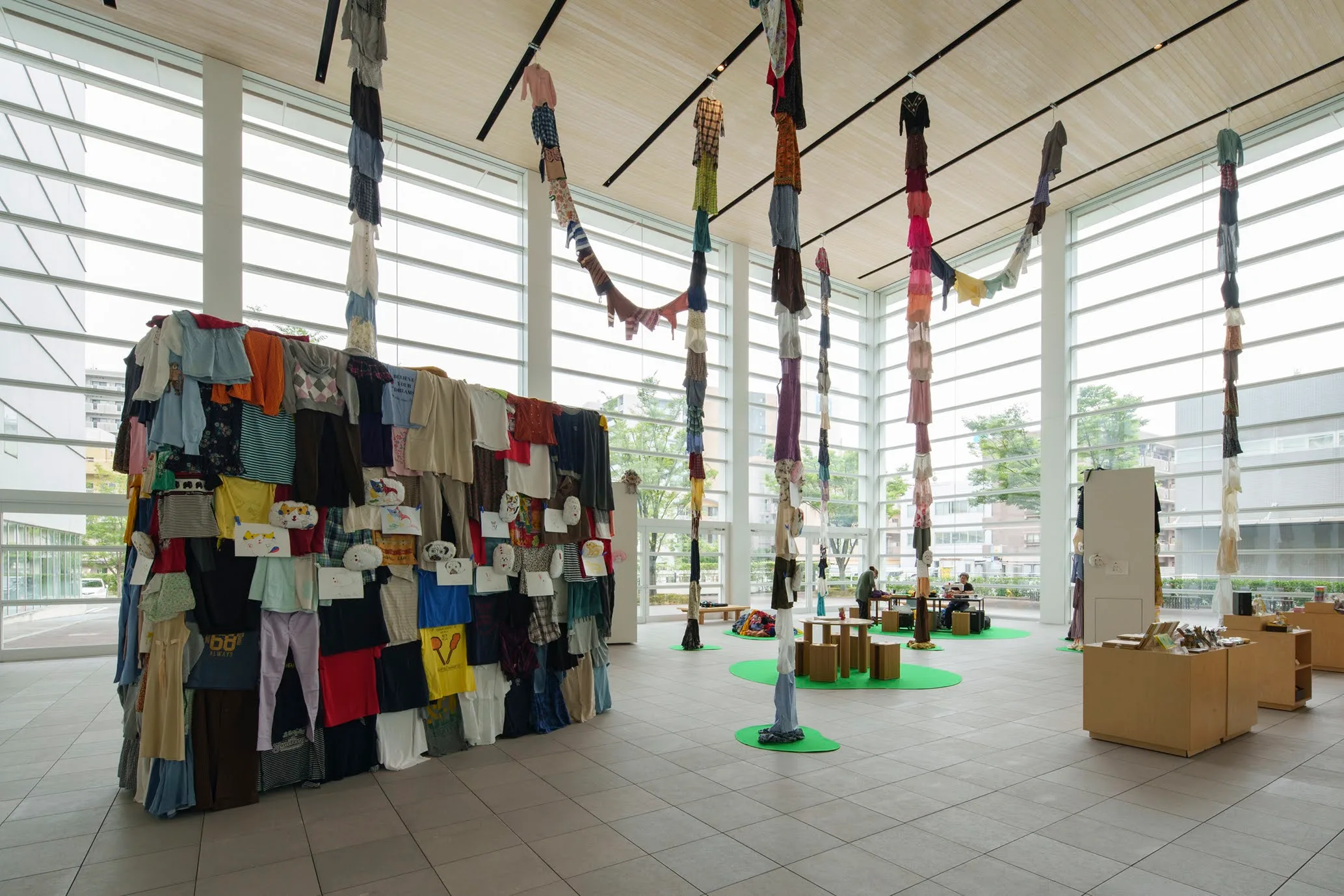 古着やハギレを使ったソフトスカルプチャーを手掛ける安部は、美術館1階のアトリウムで、来場者が描いた絵をぬいぐるみにするワークショップ工房をオープン。会期中、毎日公開制作を行い、地元の人々から寄せられた古着で作った「森」に作品を増やし続けている。また、会場内では朝倉の猫作品の隣に、その作品を五面図化して刺繍にした《ネコバッグ》(2023)を展示している。